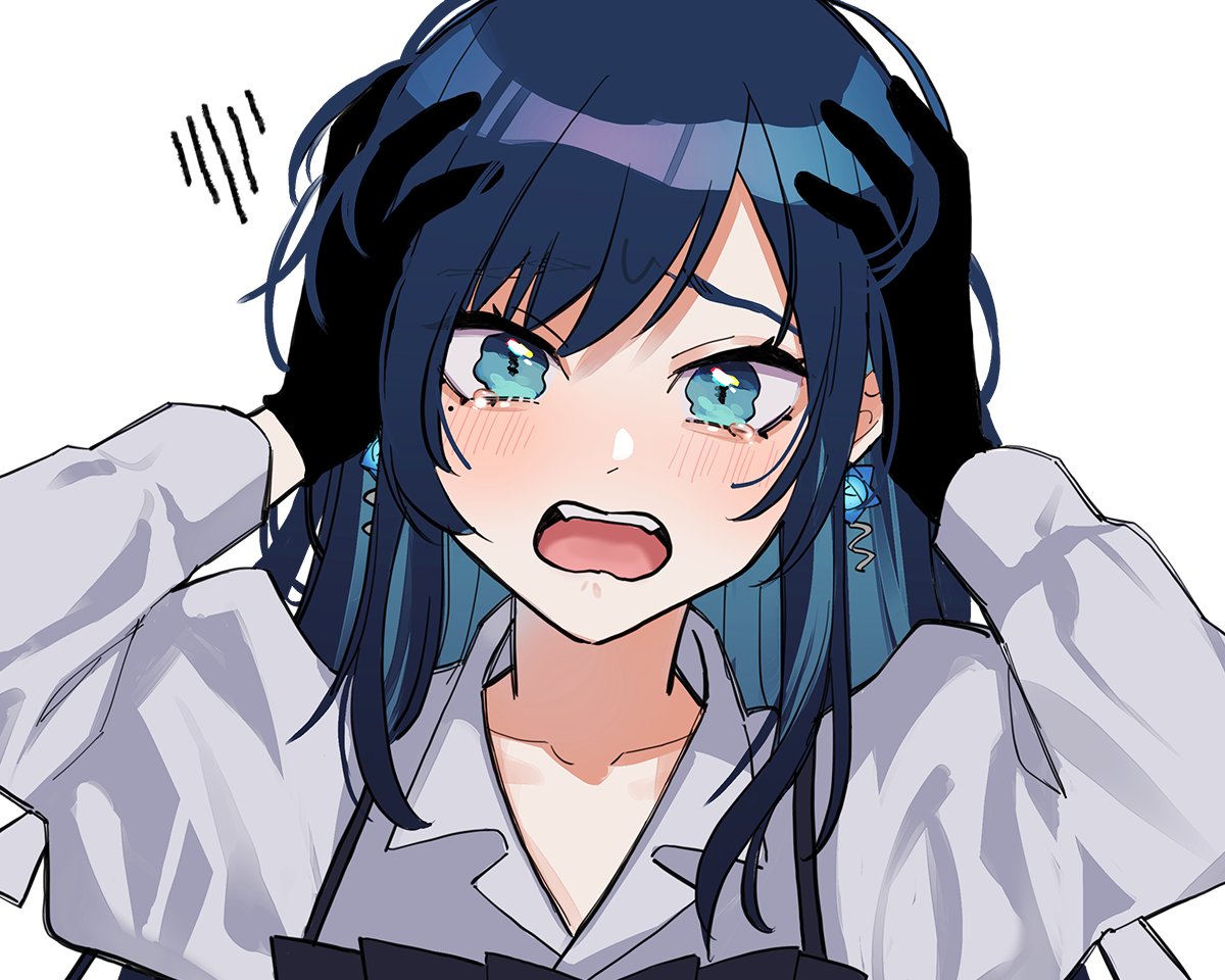 1girl ado_(utaite) black_gloves blue_eyes blue_hair blush chando_(ado) cloud_nine_inc collarbone collared_shirt colored_inner_hair commentary_request earrings gloves hands_on_own_head jewelry long_hair long_sleeves looking_at_viewer mole mole_under_eye multicolored_hair open_mouth riseno shirt sidelocks simple_background solo tearing_up teeth two-tone_hair upper_body upper_teeth_only utaite white_background white_shirt