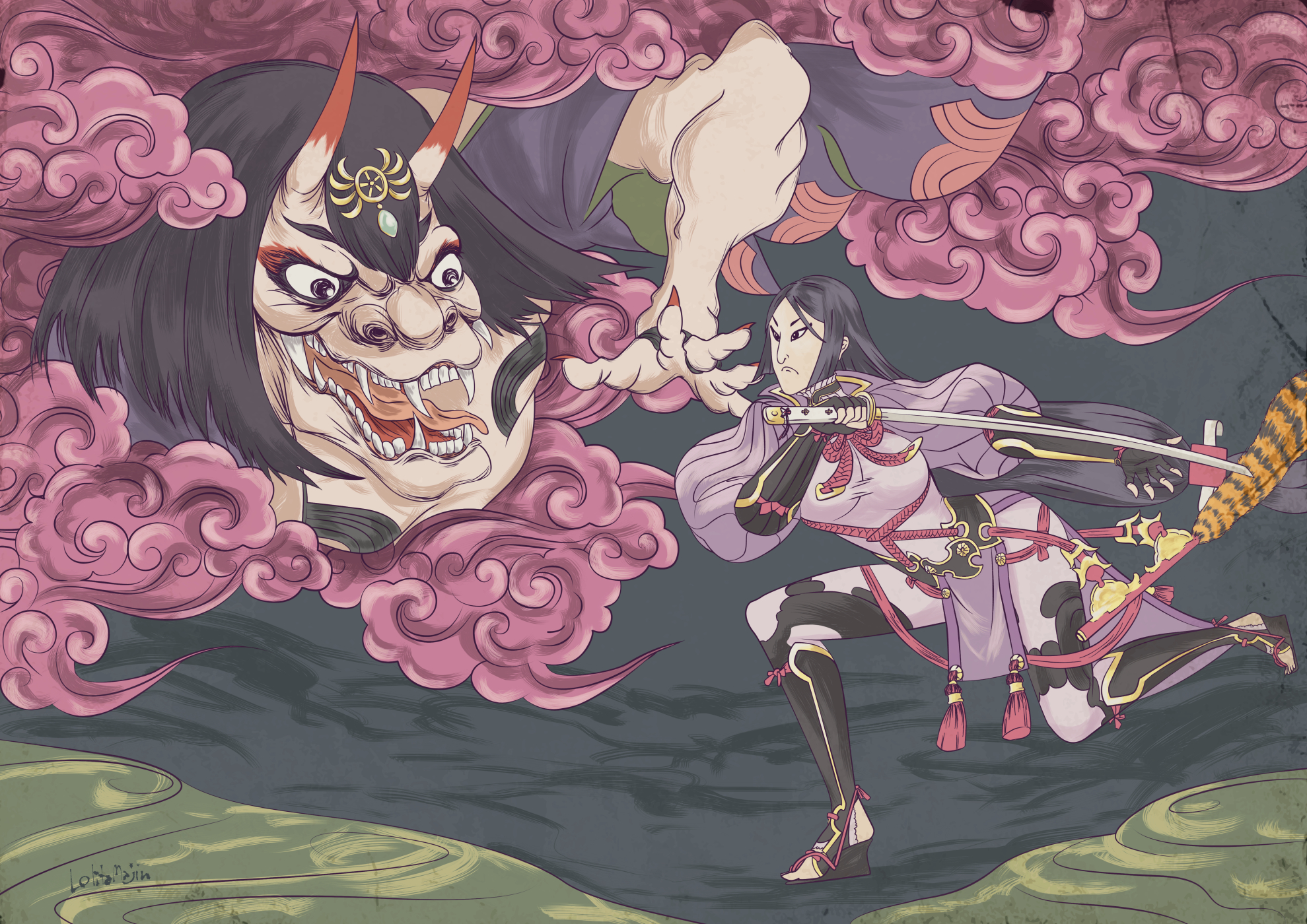 2girls black_hair bob_cut boots breasts fangs fate/grand_order fate_(series) fine_art_parody fingerless_gloves flat_chest gloves highres horns japan japanese_clothes large_breasts lolita_majin long_hair minamoto_no_raikou_(fate) multiple_girls nail_polish nihonga oni parody parted_bangs puffy_sleeves purple_hair red_nails short_hair shuten_douji_(fate) skin-covered_horns style_parody tongue ukiyo-e