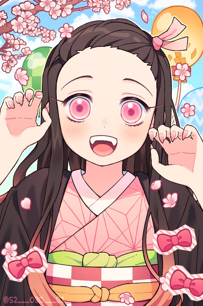 1girl black_hair demon forehead gradient_hair hair_ribbon haori japanese_clothes kamado_nezuko kimetsu_no_yaiba kimono long_hair long_sleeves multicolored_hair open_mouth orange_hair pink_eyes pink_kimono pink_ribbon ribbon shimya solo teeth tongue very_long_hair