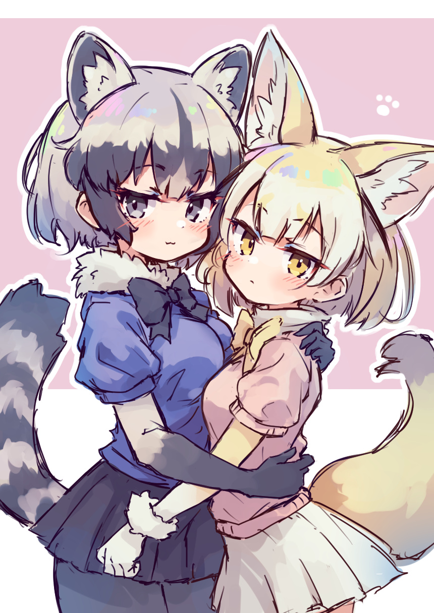 2girls animal_ears black_bow black_bowtie black_pantyhose black_skirt blonde_hair blue_eyes blue_sweater blush bow bowtie comiket_103 common_raccoon_(kemono_friends) cowboy_shot elbow_gloves extra_ears fennec_(kemono_friends) fox_ears fox_girl fox_tail fur_collar gloves grey_gloves grey_hair hair_between_eyes height_difference highres kemono_friends kolshica multicolored_hair multiple_girls pantyhose pink_sweater pleated_skirt puffy_short_sleeves puffy_sleeves raccoon_ears raccoon_girl raccoon_tail short_hair short_sleeves sidelocks skirt sweater tail two-tone_gloves white_fur white_gloves white_hair white_skirt yellow_bow yellow_bowtie yellow_eyes yellow_gloves