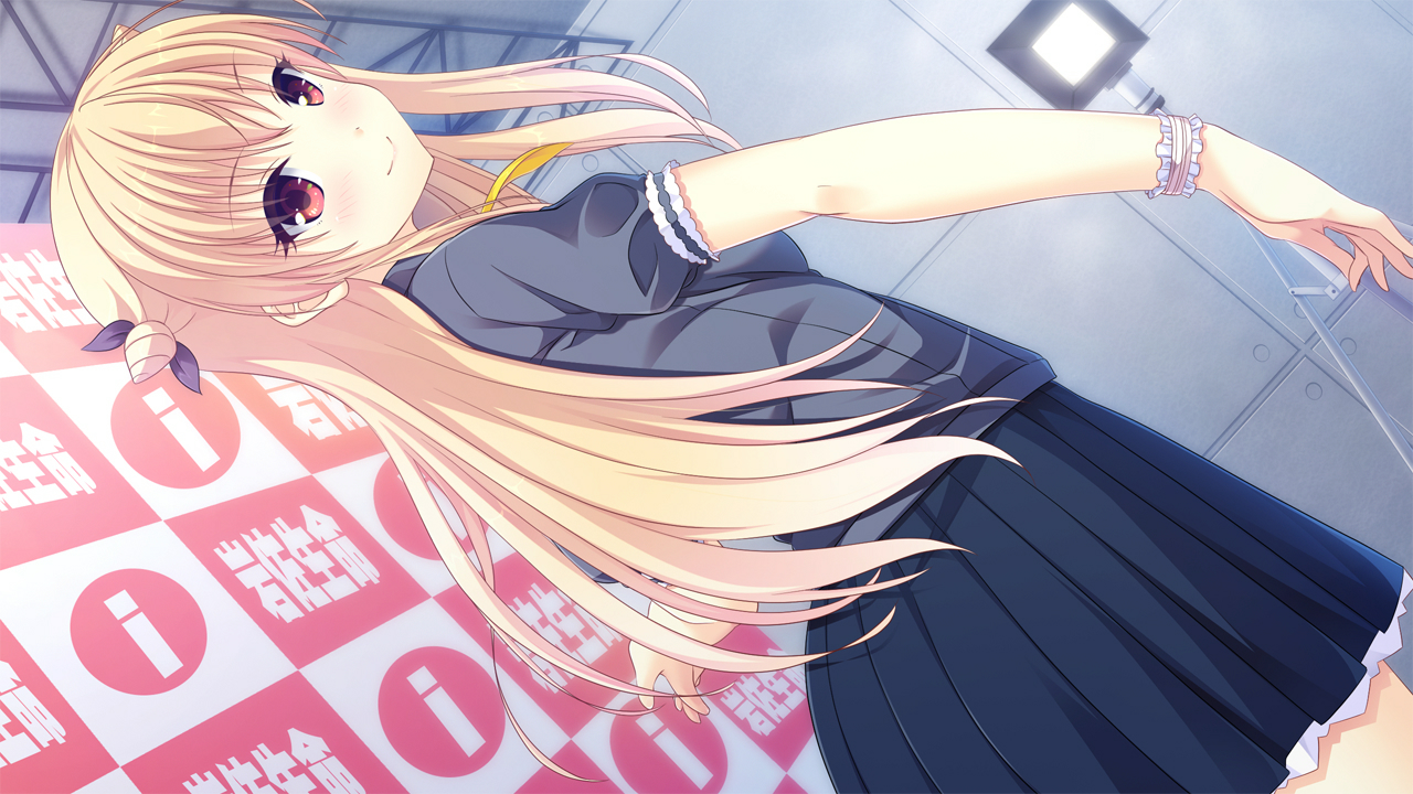 1girl black_skirt blonde_hair blush closed_mouth double_bun frilled_sleeves frills game_cg hair_bun kanome_reina long_hair looking_at_viewer making_lover non-web_source official_art pleated_skirt promotional_art red_eyes self-datamine short_sleeves skirt smile solo taniyama-san wrist_cuffs