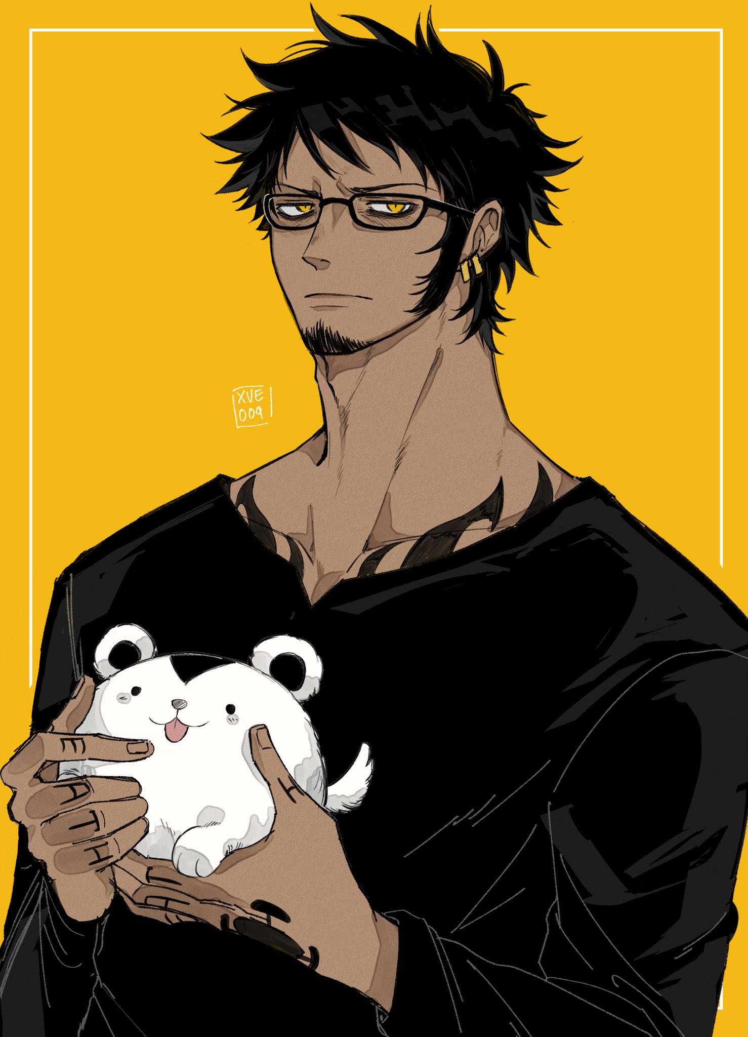 1boy animal black_shirt chest_tattoo closed_mouth commentary earrings english_commentary facial_hair glasses goatee hand_tattoo highres holding holding_animal jewelry light_frown long_sleeves looking_at_viewer male_focus one_piece shirt short_hair tattoo tongue tongue_out trafalgar_law xve009 yellow_background yellow_eyes