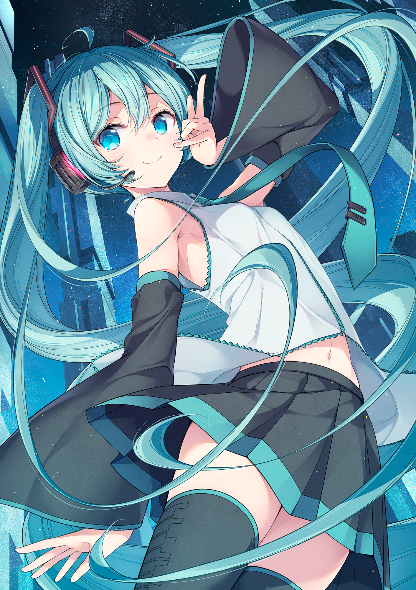 1girl ahoge aqua_eyes aqua_hair aqua_necktie arm_up bare_shoulders black_skirt black_sleeves black_thighhighs breasts comiket_103 detached_sleeves hair_between_eyes hatsune_miku headphones highres long_hair looking_at_viewer matsuuni medium_breasts midriff navel necktie pleated_skirt shirt sidelocks skirt sky sleeveless sleeveless_shirt smile solo thighhighs tie_clip twintails v very_long_hair vocaloid white_shirt wide_sleeves