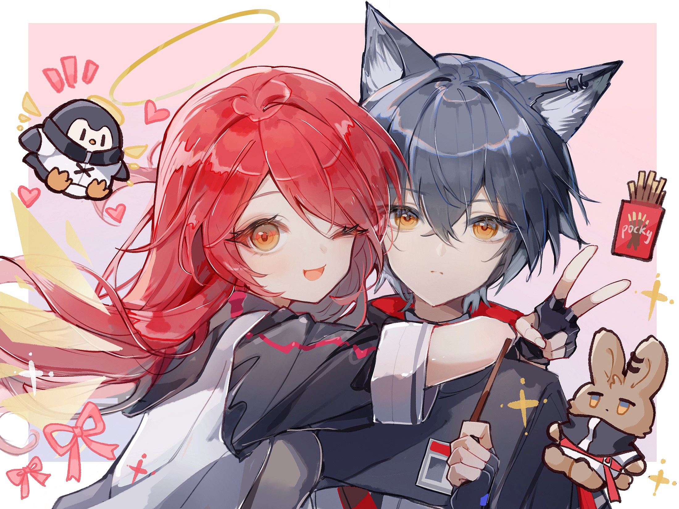 2girls ;d alternate_hair_length alternate_hairstyle animal_ears animalization arknights arms_around_neck bird black_gloves black_hair black_hoodie black_shirt breast_press closed_mouth commentary_request crossed_bangs earrings energy_wings expressionless exusiai_(arknights) fingerless_gloves food gloves hair_length_switch halo heart highres holding holding_food holding_pocky hood hood_down hoodie hug jewelry long_hair looking_at_viewer multiple_girls notice_lines one_eye_closed open_mouth orange_eyes parted_bangs penguin pink_ribbon pocky rabbit red_hair ribbon shirt short_hair short_sleeves smile tency_(1733djy) texas_(arknights) upper_body vest white_vest wolf_ears wolf_girl