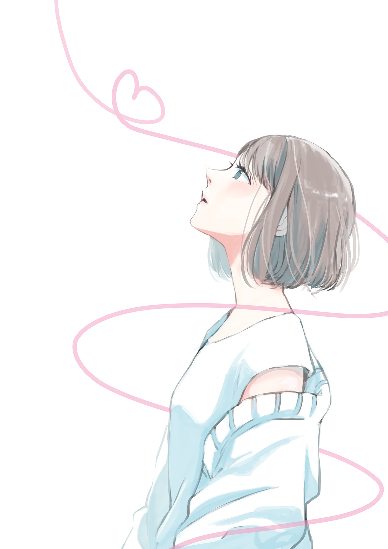 1girl bob_cut brown_hair cardigan casual from_side grey_hair heart heart_of_string highres long_sleeves looking_up nasu_rei off_shoulder parted_lips profile rico_gyouza shirt short_hair simple_background solo upper_body white_background white_shirt world_trigger