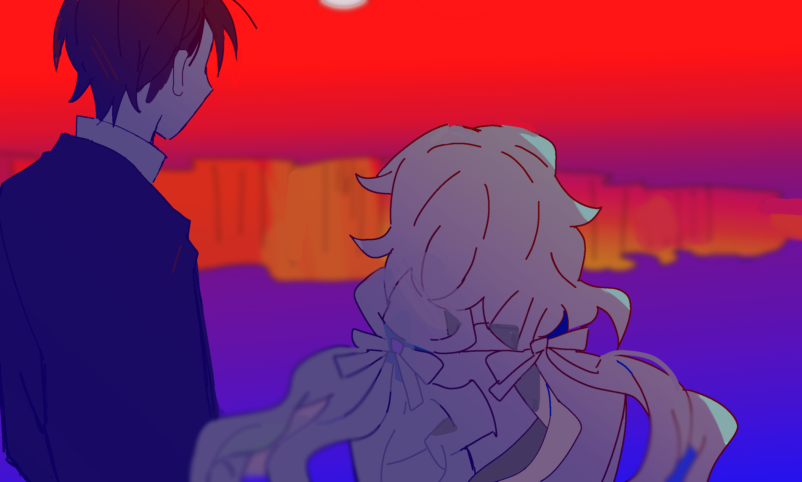 1boy 1girl black_hair black_jacket black_sleeves blue_background bow charlotte_wiltshire collared_shirt commentary_request from_behind gradient_background hair_bow height_difference hello_charlotte highres hole jacket long_hair long_sleeves low_twintails red_background shirt short_hair sunset tiankong_yiji twintails upper_body vincent_wordsworth white_bow white_hair white_shirt white_sleeves
