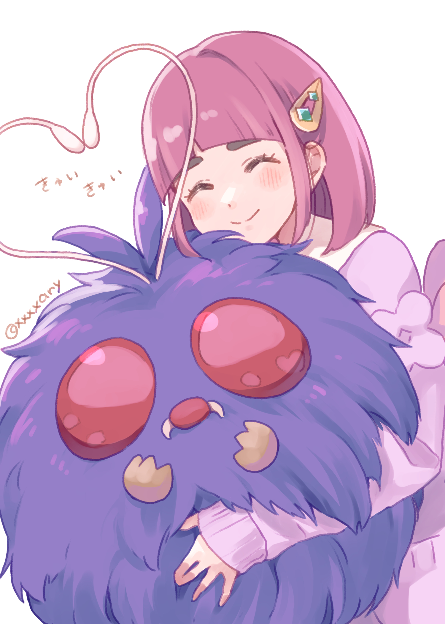 1girl blush cardigan closed_eyes closed_mouth commentary_request eyelashes gen_1_pokemon hair_ornament hairclip heart highres holding holding_pokemon lacey_(pokemon) long_sleeves nintendo pokemon pokemon_(creature) pokemon_scarlet_and_violet sidelocks smile translation_request venonat white_background xxxxay