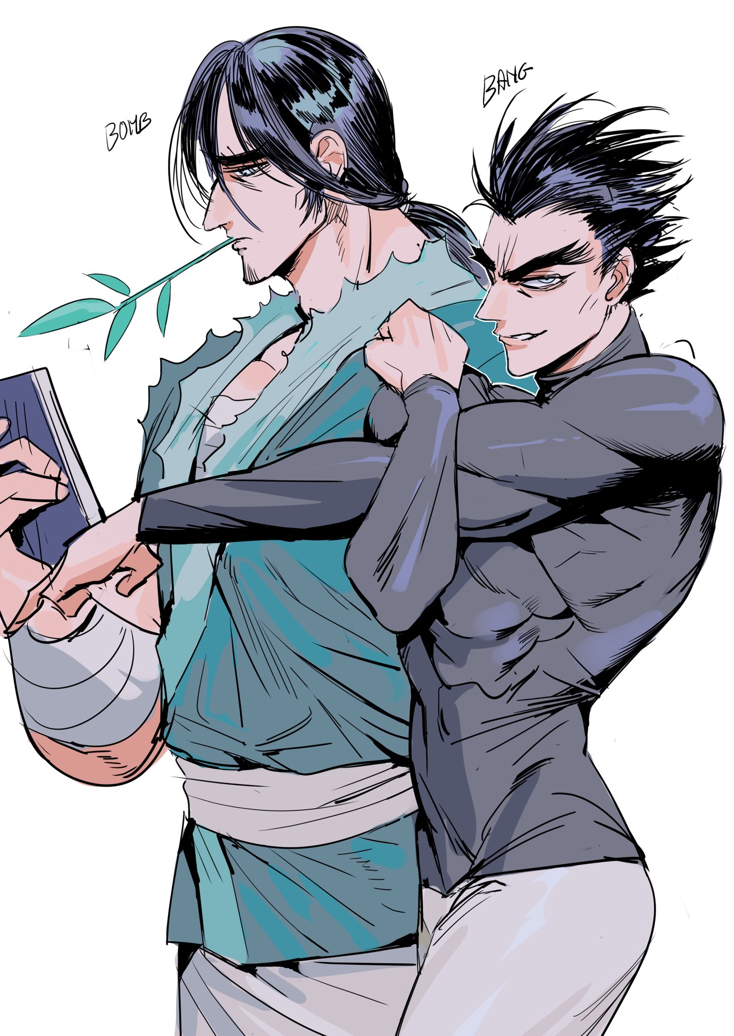 2boys bang_(one-punch_man) bomb_(one-punch_man) brothers highres long_hair male_focus multiple_boys muscular muscular_male non-web_source one-punch_man siblings thick_eyebrows