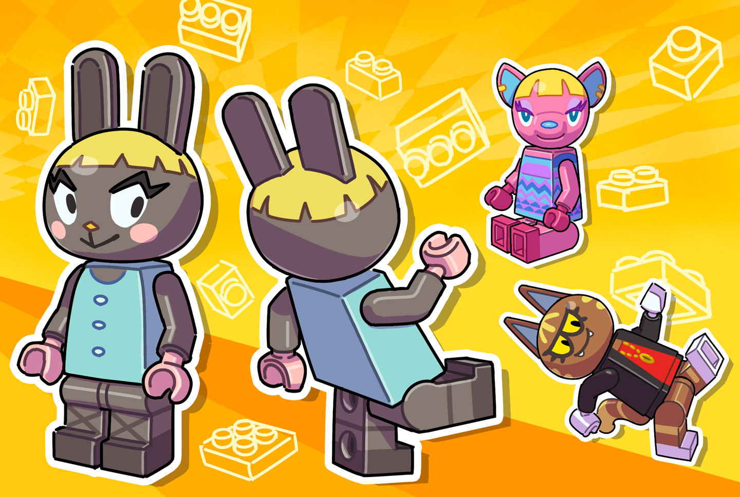 3girls animal_crossing animal_ears blonde_hair blue_eyes bonbon_(animal_crossing) cat_ears cat_tail deer_ears ear_piercing eyelashes fangs fuchsia_(animal_crossing) katt_(animal_crossing) kopa_nishikida lego looking_at_viewer multicolored_background multiple_girls nintendo piercing rabbit_ears sitting tail yellow_eyes