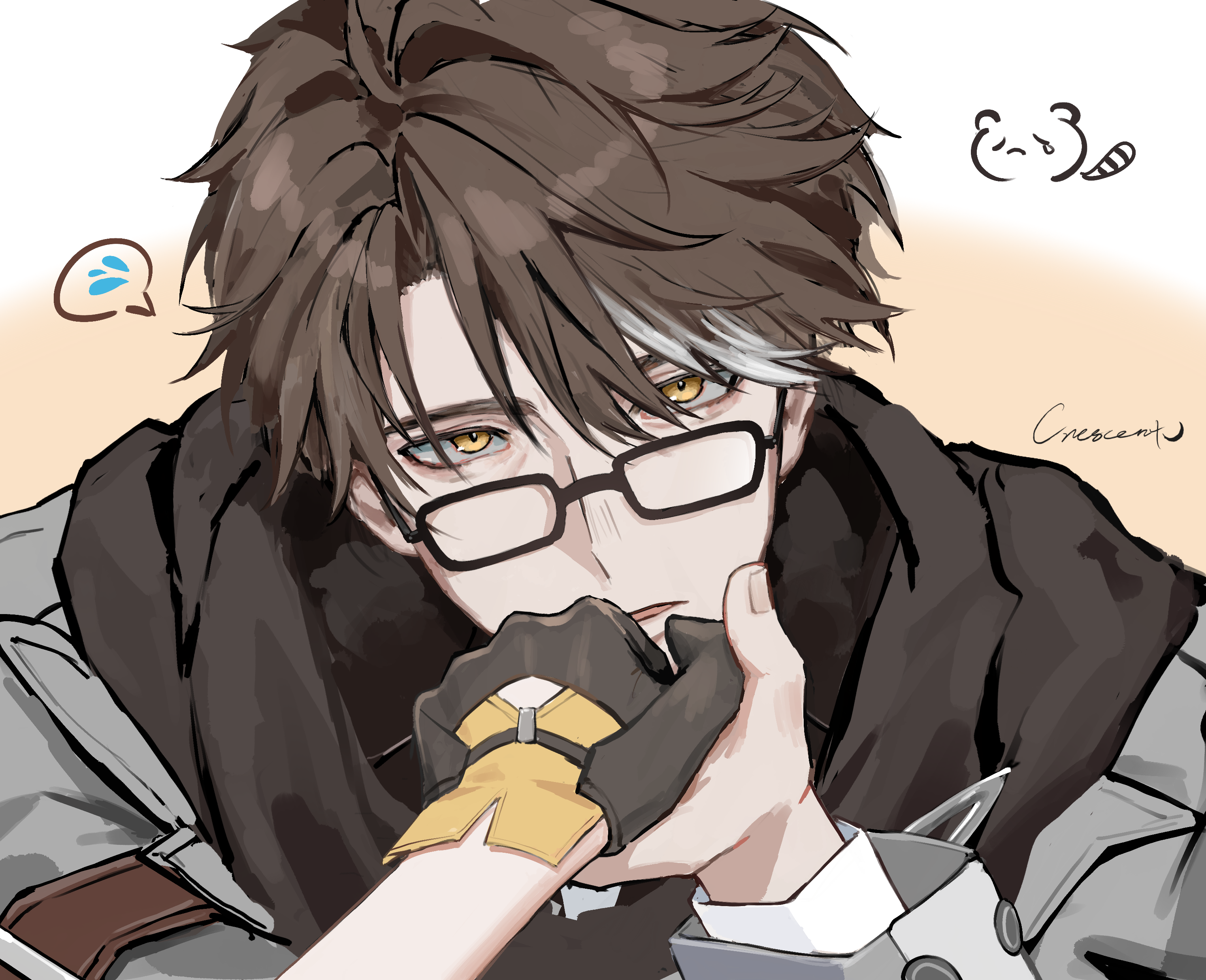 1boy 1girl absurdres black-framed_eyewear black_gloves brown_hair brown_hood chinese_commentary colored_tips commentary flying_sweatdrops glasses gloves hetero highres holding_hands honkai:_star_rail honkai_(series) kiss kissing_hand looking_at_viewer male_focus multicolored_hair parted_lips pov pov_hands short_hair shuofei_crescent signature spoken_flying_sweatdrops stelle_(honkai:_star_rail) straight-on trailblazer_(honkai:_star_rail) welt_yang yellow_eyes