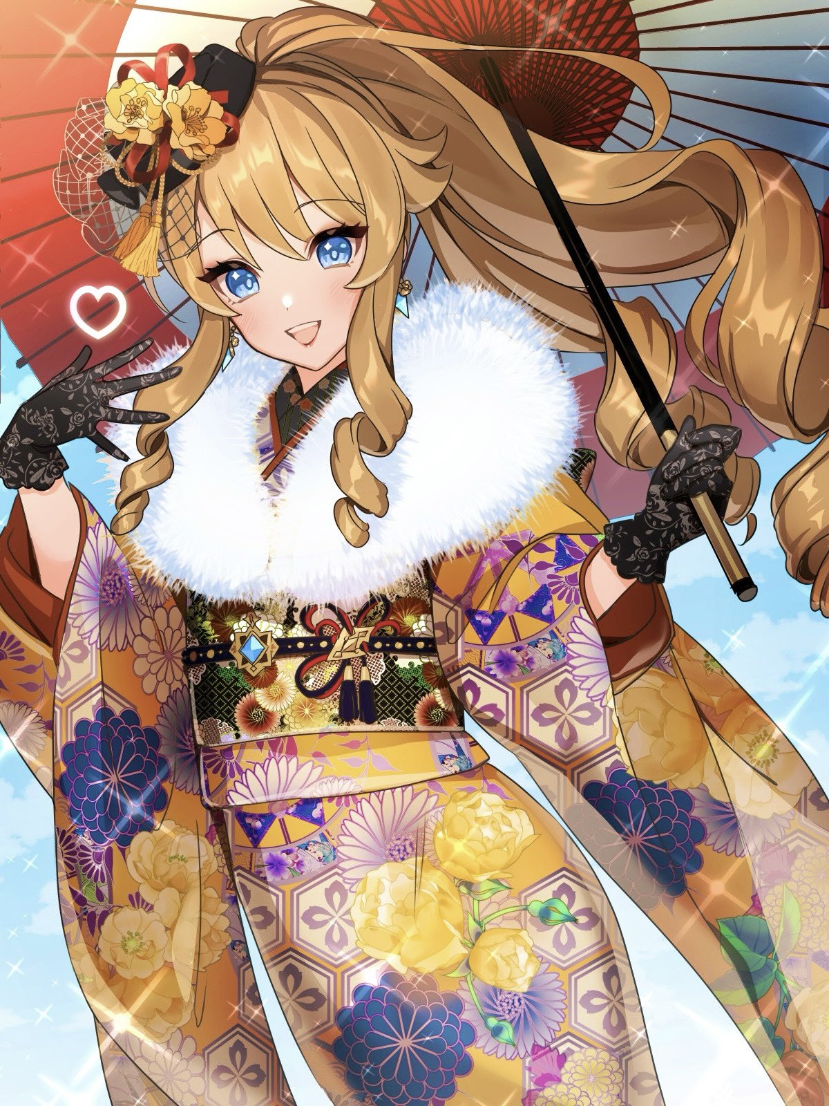 1girl :d alternate_costume black_gloves black_headwear blonde_hair blue_eyes commentary_request cowboy_shot drill_hair drill_sidelocks feather_boa floral_print floral_print_kimono genshin_impact gloves highres holding holding_umbrella japanese_clothes kimono lllkalllwalll long_hair looking_at_viewer navia_(genshin_impact) obi open_mouth ponytail print_kimono sash sidelocks smile solo standing umbrella very_long_hair yellow_kimono