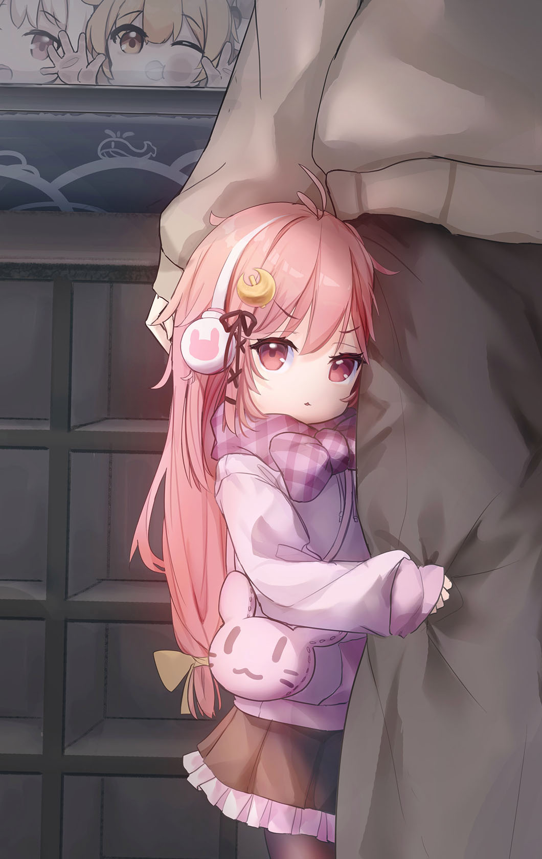 4girls against_glass aged_down ahoge black_pantyhose black_skirt brown_sweater character_request crescent crescent_hair_ornament earmuffs hair_ornament highres hug indoors kantai_collection logiclr long_hair looking_at_viewer multiple_girls pantyhose pink_eyes pink_hair pink_sweater scarf skirt sweater uzuki_(kancolle) window