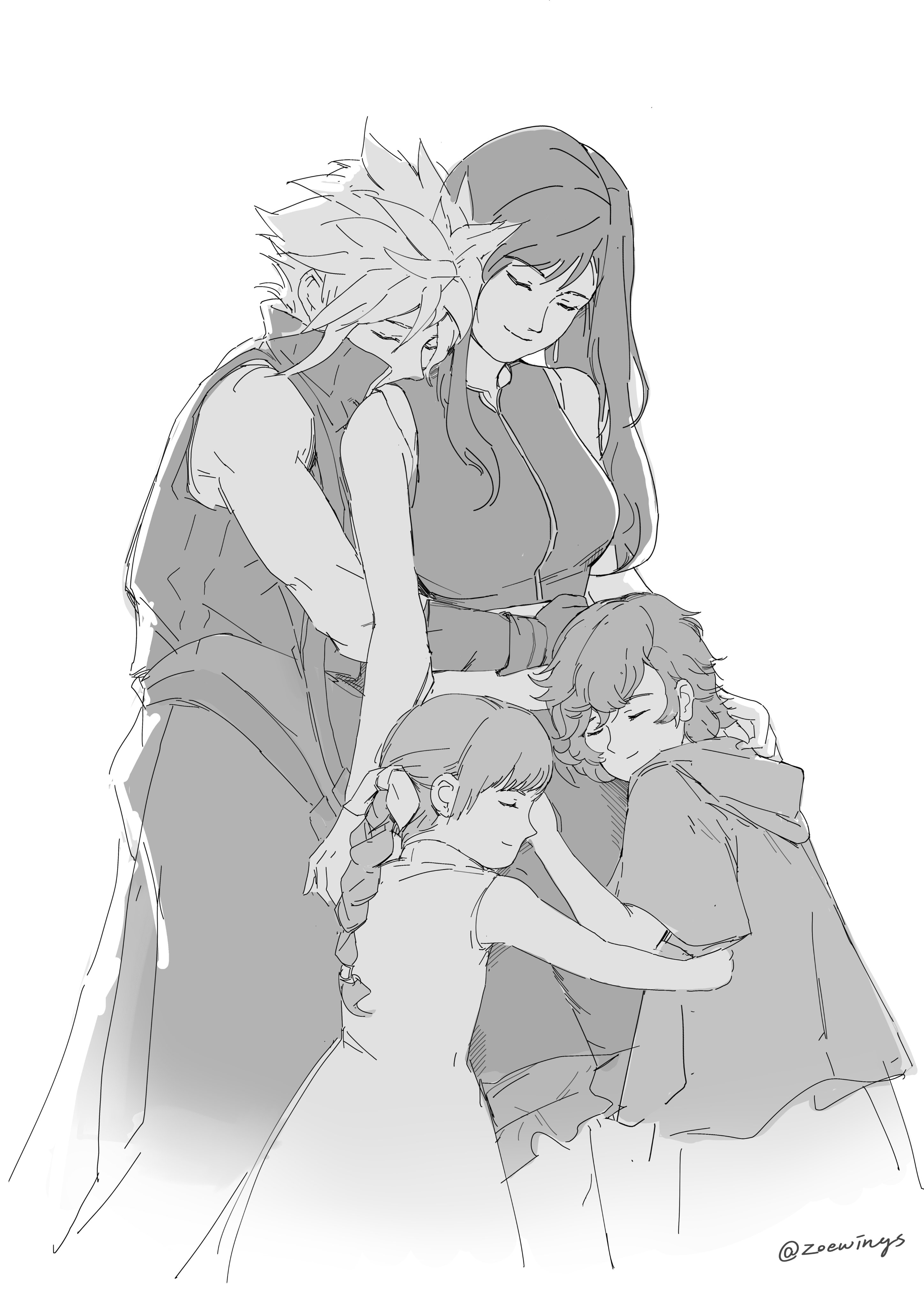 2boys 2girls absurdres apron bare_arms bare_shoulders braid braided_ponytail breasts child closed_eyes closed_mouth cloud_strife denzel_(ff7) earrings family final_fantasy final_fantasy_vii final_fantasy_vii:_advent_children greyscale hair_ribbon highres hug hug_from_behind jewelry large_breasts long_hair marlene_wallace midriff_peek monochrome multiple_boys multiple_girls ribbon shirt short_hair shorts single_earring sleeveless sleeveless_shirt smile spiked_hair square_enix swept_bangs tifa_lockhart twitter_username vest waist_apron zoewingsz