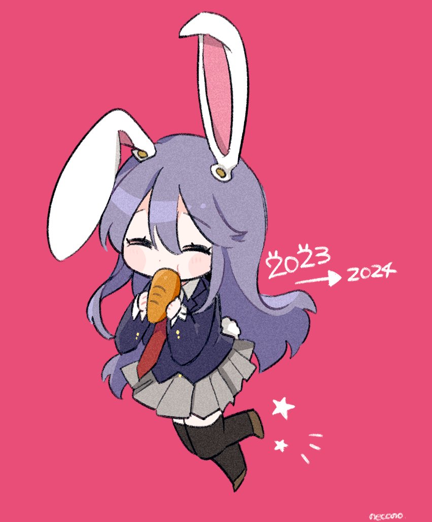 1girl animal_ears blue_jacket carrot chibi eating grey_skirt jacket necktie necono_(nyu6poko) new_year pink_background rabbit_ears rabbit_girl red_necktie reisen_udongein_inaba shirt skirt solo star_(symbol) suit_jacket touhou white_shirt