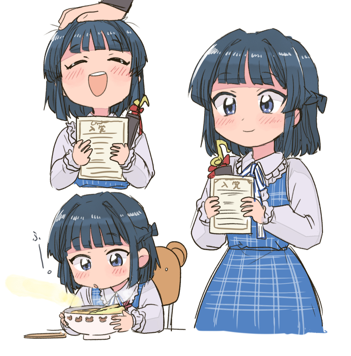 1girl :o aged_down blowing blue_dress blue_eyes blue_hair blunt_bangs blush blush_stickers bow bowl bowtie braid chair closed_mouth commentary_request dress food frilled_shirt frills hair_intakes half_updo happy headpat holding holding_trophy idolmaster idolmaster_million_live! loose_hair_strand mogami_shizuka multiple_expressions musical_note noodles on_chair open_mouth plaid_clothes plaid_dress shirt short_hair shrimp shrimp_tempura simple_background sitting sleeveless sleeveless_dress smile steam striped_bow striped_bowtie striped_clothes teeth tempura translation_request trophy tsubobot udon upper_teeth_only variations white_background white_bow white_bowtie white_shirt