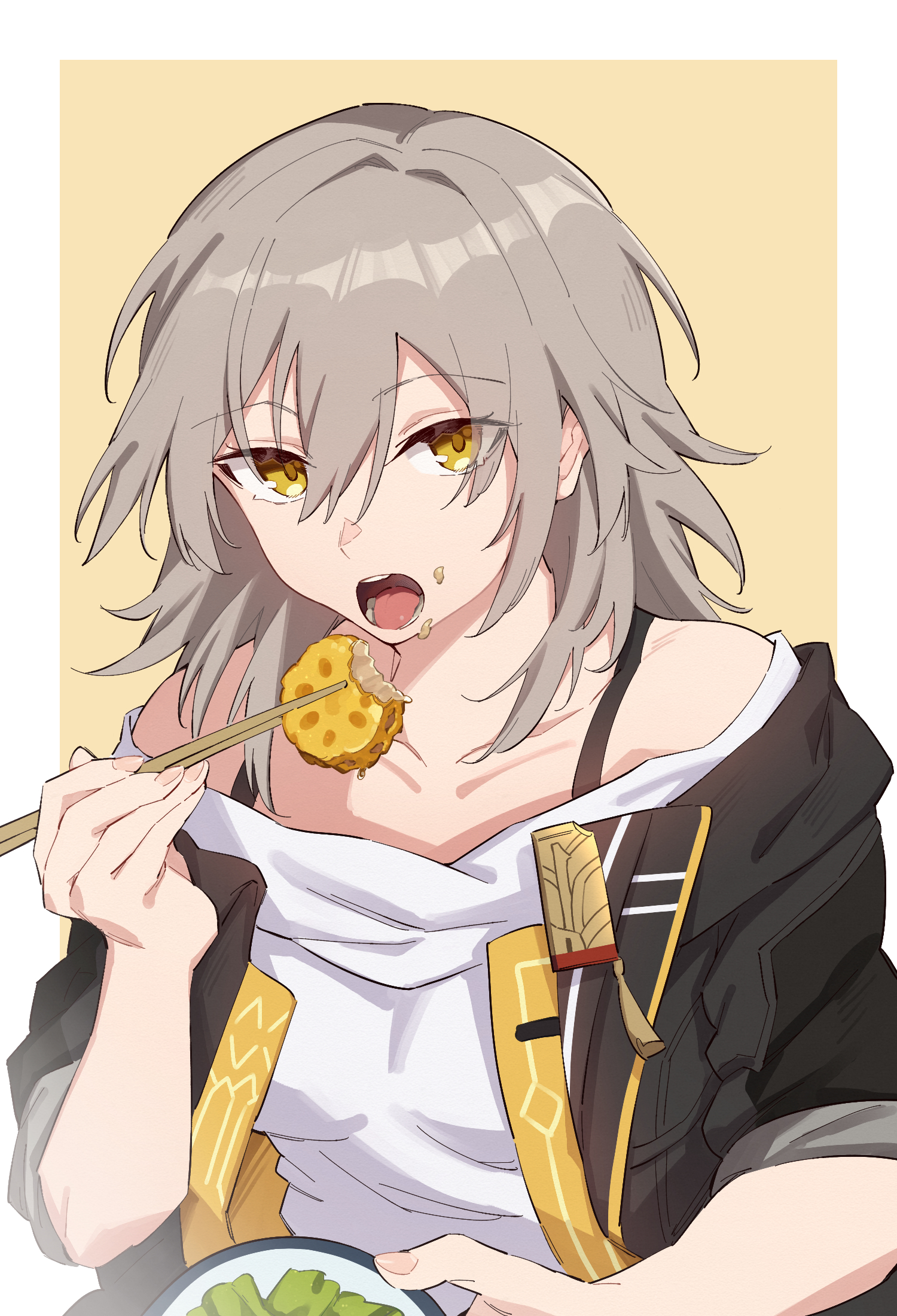 batatata77 black_jacket chopsticks eating food food_on_face grey_hair hair_between_eyes highres holding holding_chopsticks honkai:_star_rail honkai_(series) jacket looking_at_viewer medium_hair mihoyo open_mouth shirt simple_background stelle_(honkai:_star_rail) tank_top trailblazer_(honkai:_star_rail) upper_body white_background white_shirt yellow_eyes