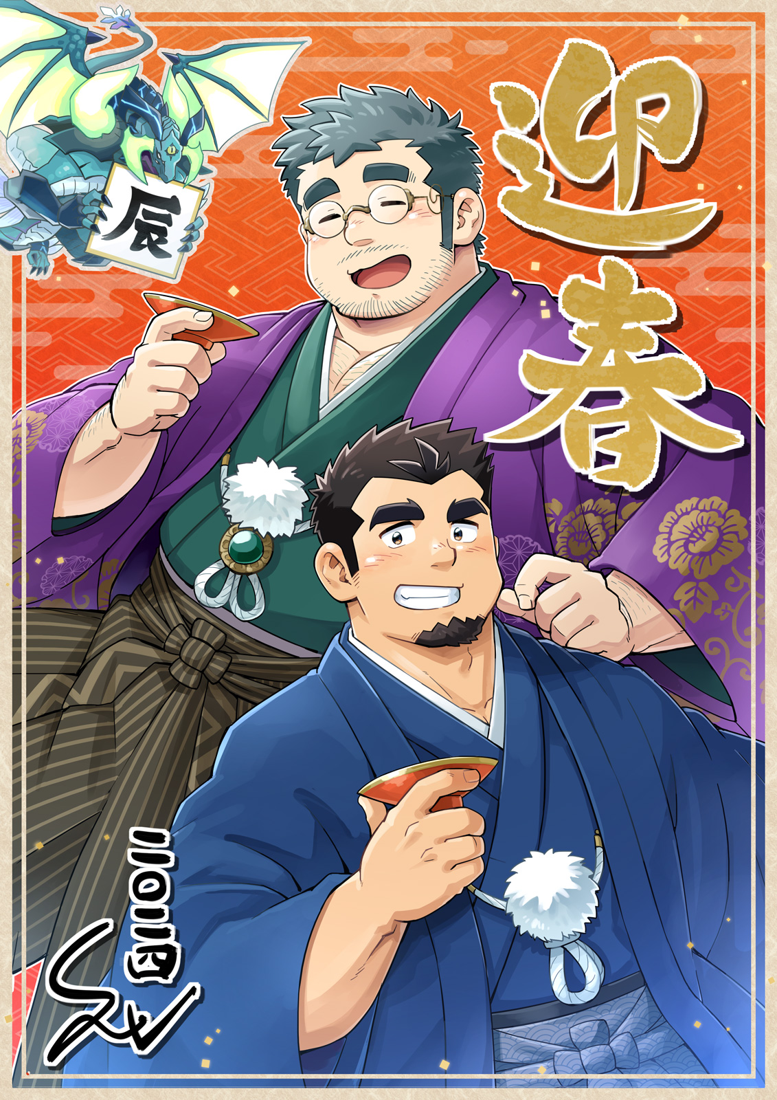 2boys bara beard black_hair blue_kimono blush chest_hair chinese_zodiac choko_(cup) closed_eyes crave_saga cup dragon facial_hair fat fat_man glasses goatee green_kimono grey_hair grin hakama hakama_pants haori highres holding holding_cup japanese_clothes jeron_(crave_saga) kimono looking_at_viewer male_focus multiple_boys muscular muscular_male new_year official_alternate_costume open_mouth pants pectoral_cleavage pectorals protagonist_(crave_saga) round_eyewear short_hair sideburns_stubble smile sparse_chest_hair stubble suv_(suv032) thick_beard thick_eyebrows translation_request year_of_the_dragon