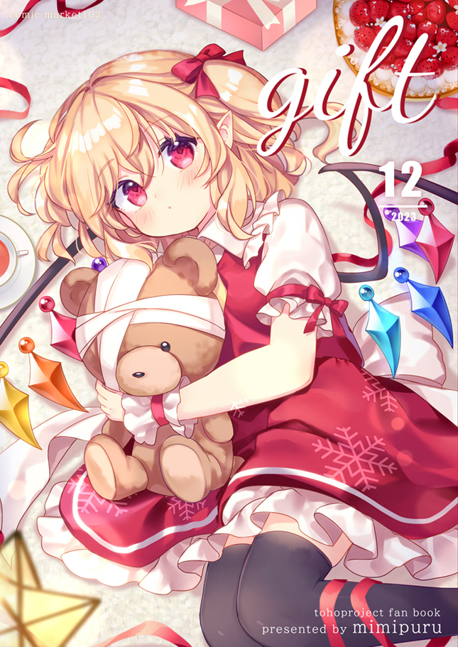 1girl ascot bandages black_thighhighs blonde_hair blush box cake comiket_103 crystal_wings dress flandre_scarlet food frilled_skirt frilled_sleeves frilled_wrist_cuffs frills gift gift_box hair_between_eyes looking_at_viewer lying medium_hair mimi_(mimi_puru) on_side puffy_sleeves red_dress red_eyes red_ribbon ribbon short_side_ponytail side_ponytail sidelocks skirt strawberry_shortcake stuffed_animal stuffed_toy teddy_bear thighhighs touhou wings wrist_cuffs zettai_ryouiki