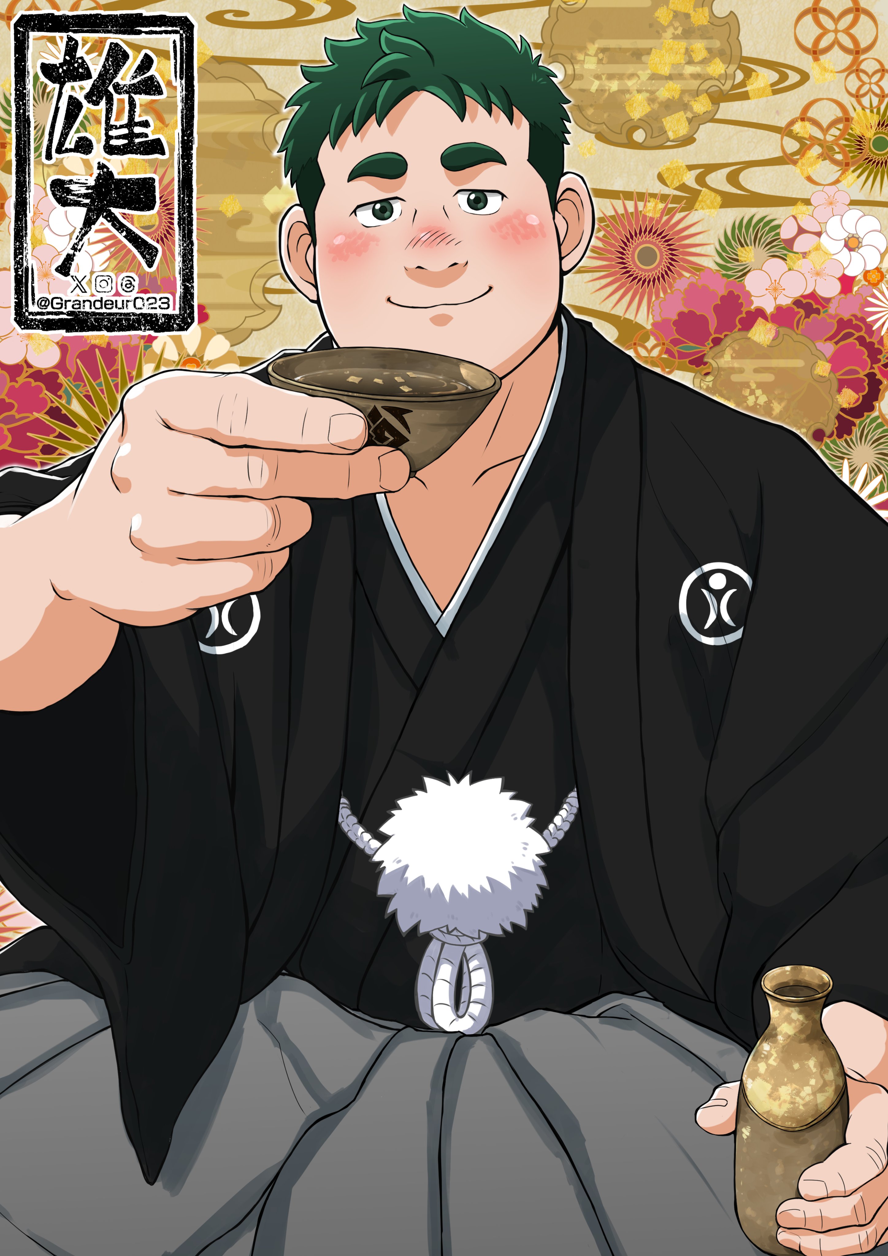 1boy absurdres bara black_kimono blush bottle choko_(cup) closed_mouth collarbone crave_saga cup green_eyes green_hair hakama hakama_pants haori highres holding holding_bottle holding_cup japanese_clothes kimono looking_at_viewer male_focus pants shmiel_(crave_saga) short_hair smile solo thick_eyebrows toasting_(gesture) tokkuri twitter_username yudai_(grandeur023)
