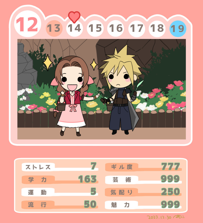 1boy 1girl aerith_gainsborough basket belt blonde_hair blue_pants blue_shirt blush boots brown_belt brown_hair buster_sword chibi closed_mouth cloud_strife derivative_work dress elbow_carry final_fantasy final_fantasy_vii final_fantasy_vii_remake flower_basket frown garden hair_ribbon holding holding_basket jacket krudears long_hair open_mouth outdoors pants parted_bangs pink_dress pink_ribbon red_jacket ribbon shirt short_hair sidelocks sleeveless sleeveless_turtleneck smile sparkle spiked_hair stats suspenders tokimeki_memorial translated turtleneck visual_novel weapon weapon_on_back