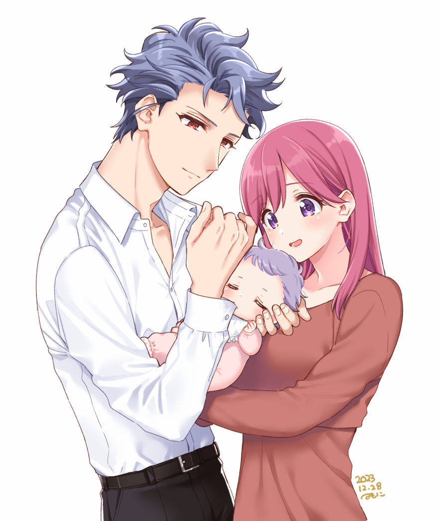 1boy 1girl 1other artist_name baby belt belt_buckle black_belt black_pants blush breasts brown_dress buckle carrying_baby carrying_person closed_eyes closed_mouth collared_shirt dated dress grey_hair if_they_mated krudears long_hair long_sleeves medium_breasts open_mouth pants parent_and_child pink_hair protagonist_(tokimemo_gs3) purple_eyes red_eyes shirt shitara_seiji short_hair smile tokimeki_memorial tokimeki_memorial_girl's_side tokimeki_memorial_girl's_side_3rd_story white_background white_shirt