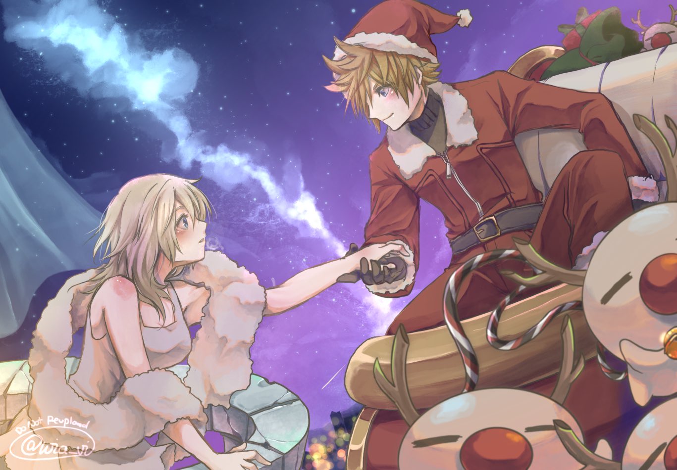 1boy 1girl balcony black_sweater blonde_hair blue_eyes blush breasts brown_gloves closed_mouth dress fur-trimmed_jacket fur_scarf fur_trim gloves hair_between_eyes hat holding_hands jacket kingdom_hearts kingdom_hearts_ii long_sleeves medium_breasts medium_hair moogle namine night pants red_headwear red_jacket red_pants roxas santa_hat short_hair sky sleeveless sleeveless_dress sleigh smile sweater turtleneck twitter_username upper_body white_dress wia_vi