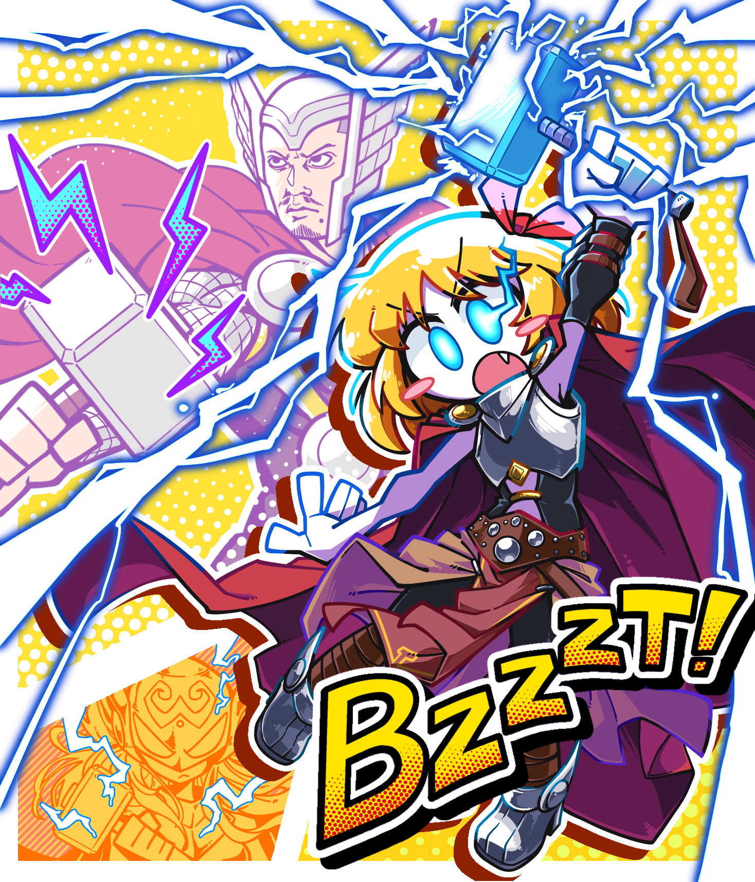 1boy 1girl amerika_zarigani arm_up armor black_eyes black_pants black_shirt blonde_hair blue_eyes blush_stickers breastplate cape chainmail closed_mouth colored_skin commentary_request cookie_(touhou) cosplay eye_trail facial_hair fang full_body hammer helmet highres holding holding_hammer light_trail looking_afar looking_at_viewer manatsu_no_yo_no_inmu marvel miura_daisenpai mjolnir_(marvel) mole mole_under_mouth mustache nadeko_(cookie) open_mouth pants purple_cape red_cape rumia serious shirt short_hair thor_(marvel) thor_(marvel)_(cosplay) touhou v-shaped_eyebrows white_skin yellow_background