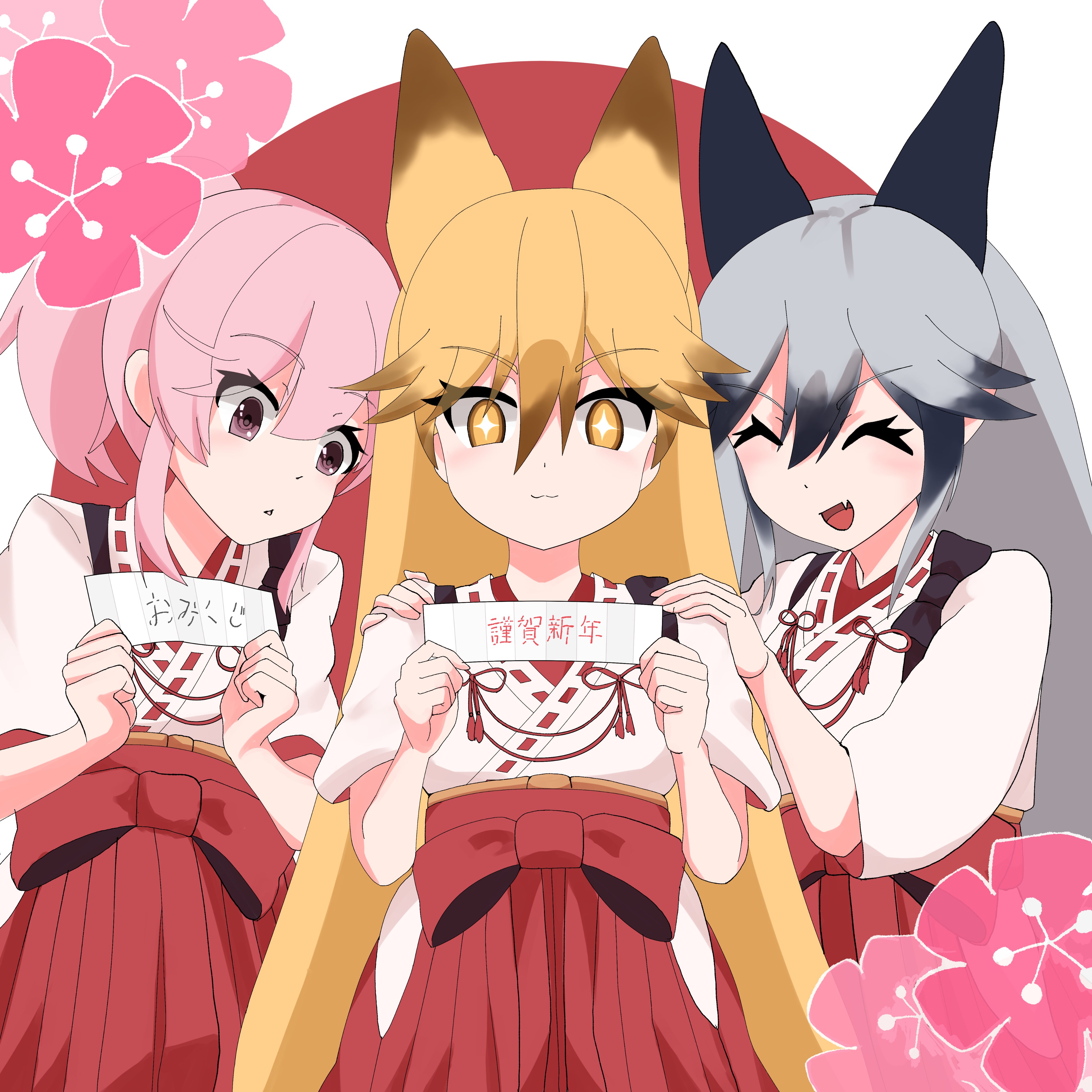 +_+ 3girls :3 ^_^ absurdres artistkitune19 black_hair blush brown_hair closed_eyes cowboy_shot extra_ears ezo_red_fox_(kemono_friends) fang grey_hair hair_between_eyes hakama hands_on_another's_shoulders highres japanese_clothes kemono_friends long_hair matching_outfits miko multicolored_hair multiple_girls nana_(kemono_friends) open_mouth orange_eyes orange_hair pink_eyes ponytail red_hakama shirt short_hair short_sleeves sidelocks silver_fox_(kemono_friends) smile translation_request white_shirt