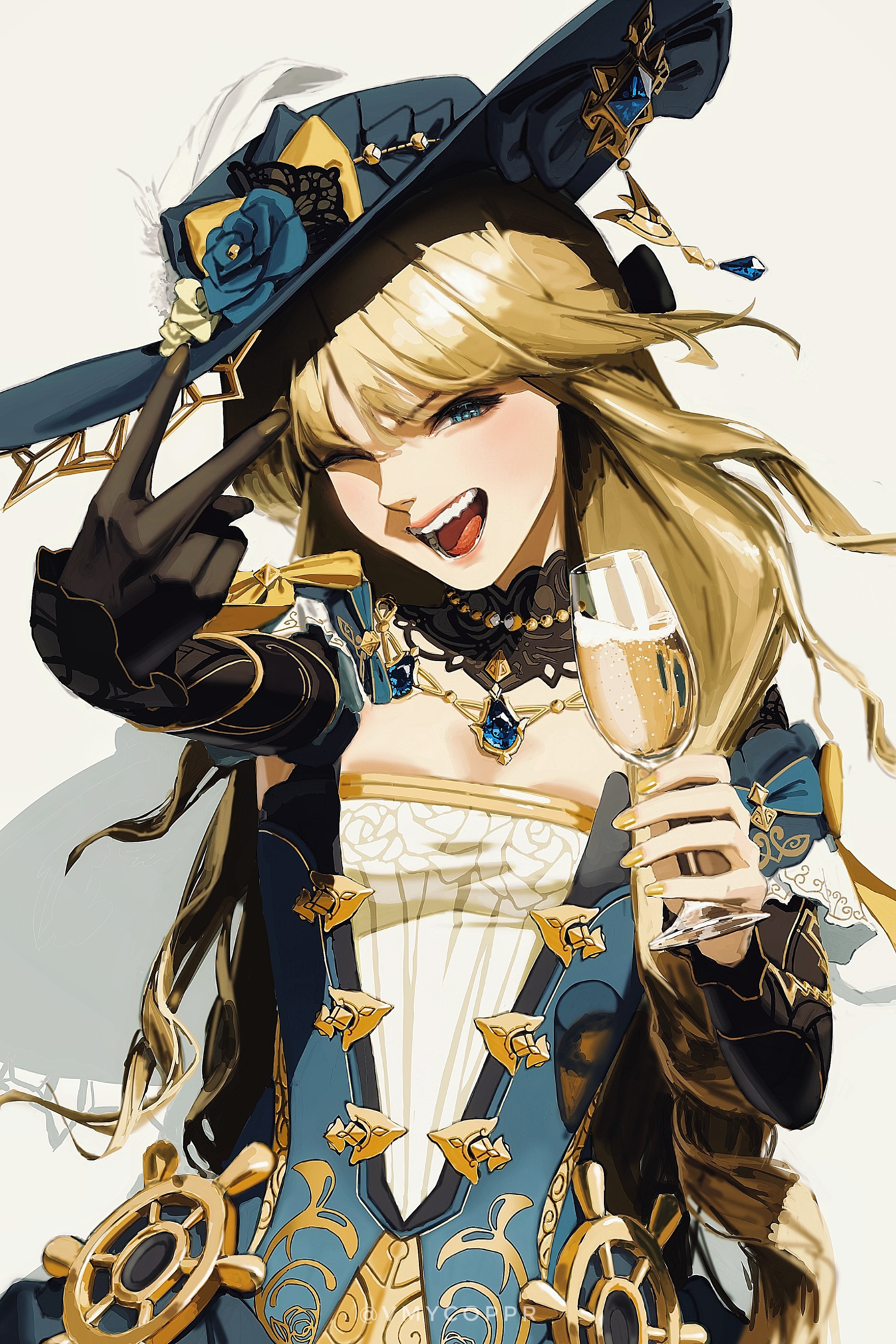 absurdres alcohol alternate_hairstyle black_gloves black_headwear black_sleeves blue_eyes blue_flower blue_gem blue_rose bodice champagne champagne_flute commentary coppr cup dress drill_hair drinking_glass english_commentary flower gem genshin_impact gloves hat hat_feather hat_flower head_tilt highres holding holding_cup lace-trimmed_collar lace_trim long_hair looking_at_viewer navia_(genshin_impact) one_eye_closed open_mouth outstretched_arm rose shadow single_glove strapless strapless_dress teeth tongue twitter_username upper_body v white_background