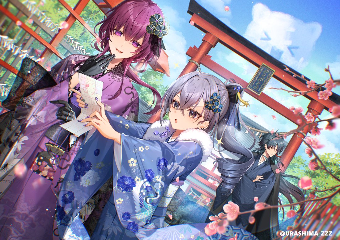 1boy 2girls black_gloves black_hair blade_(honkai:_star_rail) blue_kimono fur_trim gloves grey_eyes grey_hair hair_ornament hair_over_one_eye happy_new_year honkai:_star_rail honkai_(series) japanese_clothes kafka_(honkai:_star_rail) kimono long_hair long_sleeves multiple_girls new_year open_mouth pink_eyes pink_hair pink_kimono silver_wolf_(honkai:_star_rail) urashima_(hidoro_mgmg) yukata