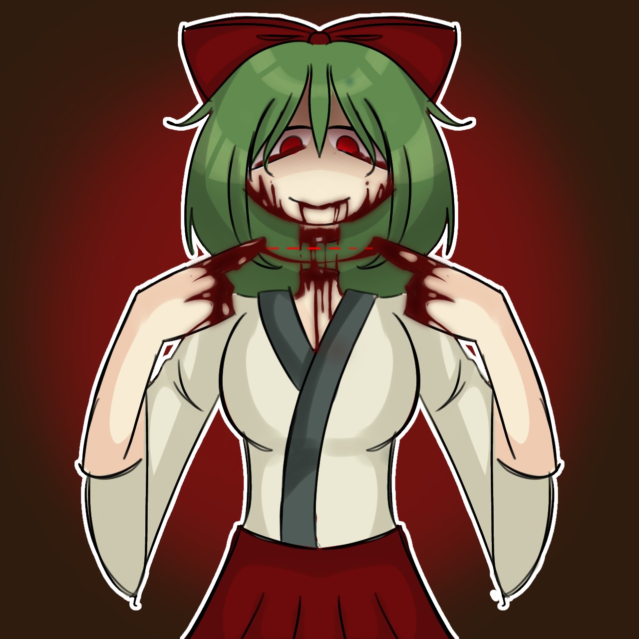 blood bow decapitation green_hair gumi highres japanese_clothes kimono mai_shishikusa masa_works_design onibi onibi_series red_bow red_eyes vocaloid