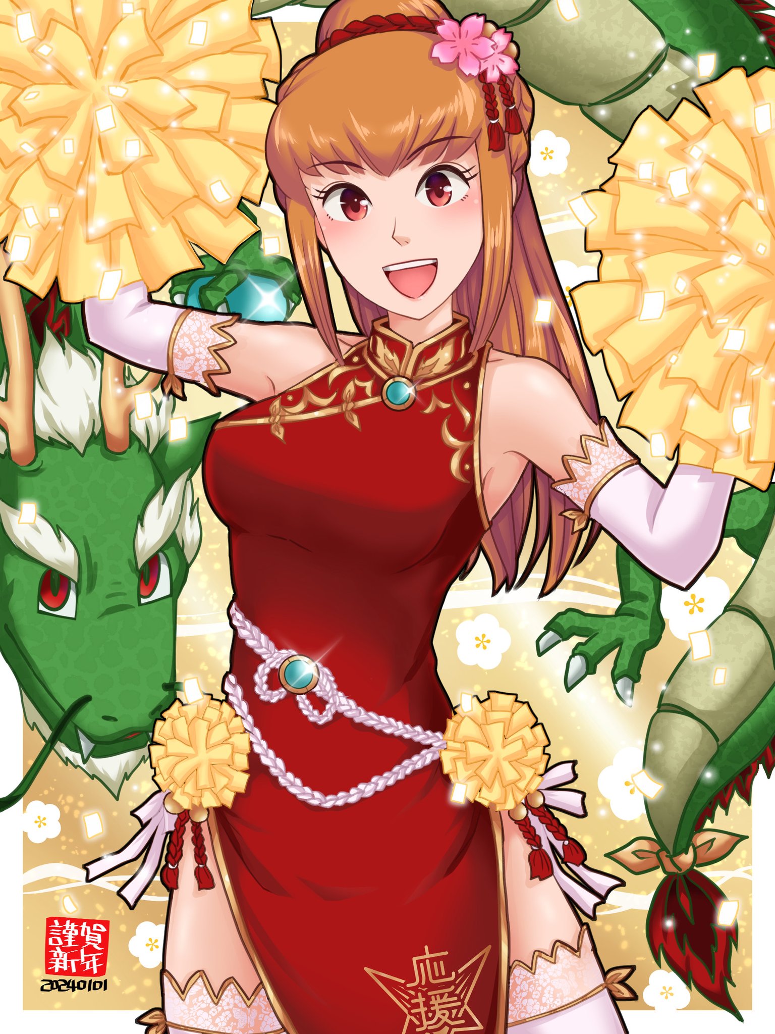 1girl amemiya_sayaka bare_shoulders breasts brown_eyes brown_hair china_dress chinese_clothes chinese_zodiac dragon dress hamu_agaki highres long_hair medium_breasts osu!_tatakae!_ouendan pom_pom_(cheerleading) ponytail red_eyes teeth upper_teeth_only year_of_the_dragon