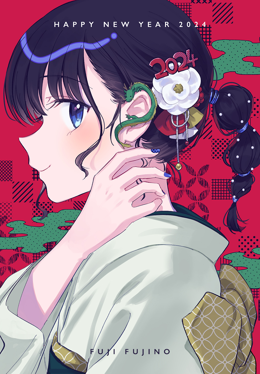 1girl 2024 back_bow black_hair blue_eyes blue_nails bow brown_bow chinese_zodiac commentary_request flower from_side fuji_fujino grey_kimono hair_flower hair_ornament hand_up happy_new_year highres japanese_clothes kimono long_sleeves nail_polish new_year original ponytail profile red_background solo upper_body white_flower wide_sleeves year_of_the_dragon