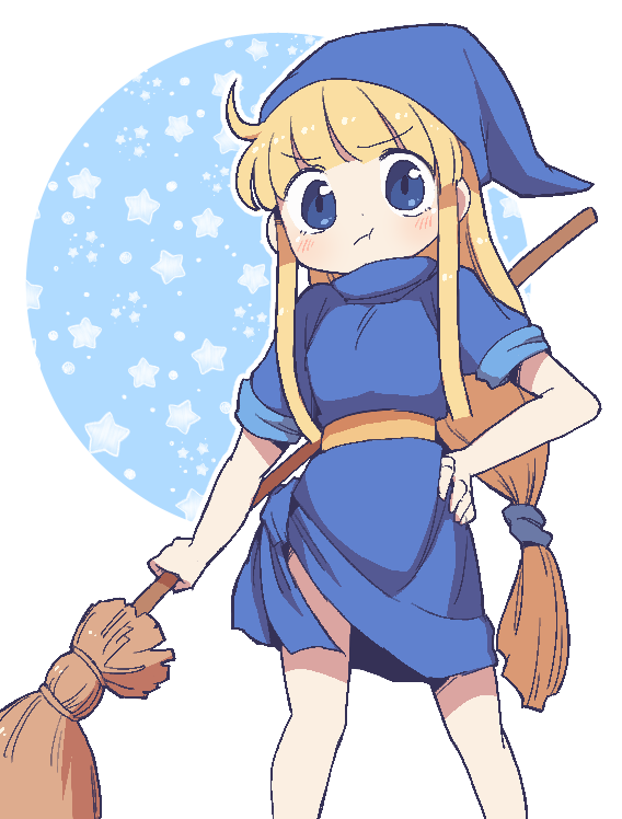 1girl :t blonde_hair blue_eyes blue_hat broom dokan_(dkn) hand_on_own_hip hat holding holding_broom jaggy_lines long_hair low-tied_long_hair madou_monogatari outline pout puyopuyo short_sleeves sidelocks solo standing tied_dress white_background white_outline witch witch_(puyopuyo)