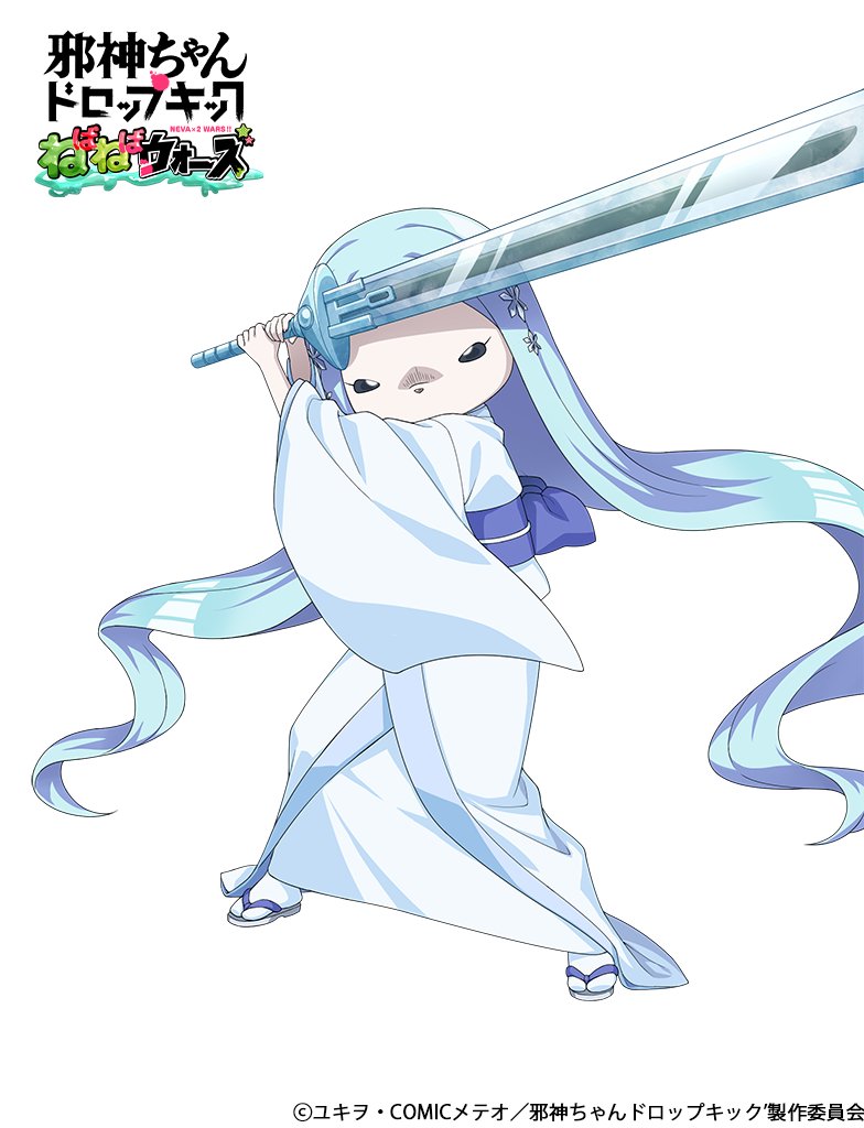 1girl 4frogsinc black_eyes blue_hair hair_ornament holding holding_sword holding_weapon japanese_clothes jashin-chan_dropkick kimono kouji_(jashin-chan_dropkick) long_hair looking_at_viewer no_mouth sandals simple_background snowflake_hair_ornament solo sword weapon white_background zouri