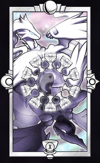 blue_eyes card_(medium) chalice claws commentary crescent cup english_commentary gen_5_pokemon legendary_pokemon limited_palette nintendo no_humans pokemon pokemon_(creature) quas-quas reshiram roman_numeral smash_ball split_theme star_(symbol) super_smash_bros. tarot tarot_(medium) yellow_eyes zekrom