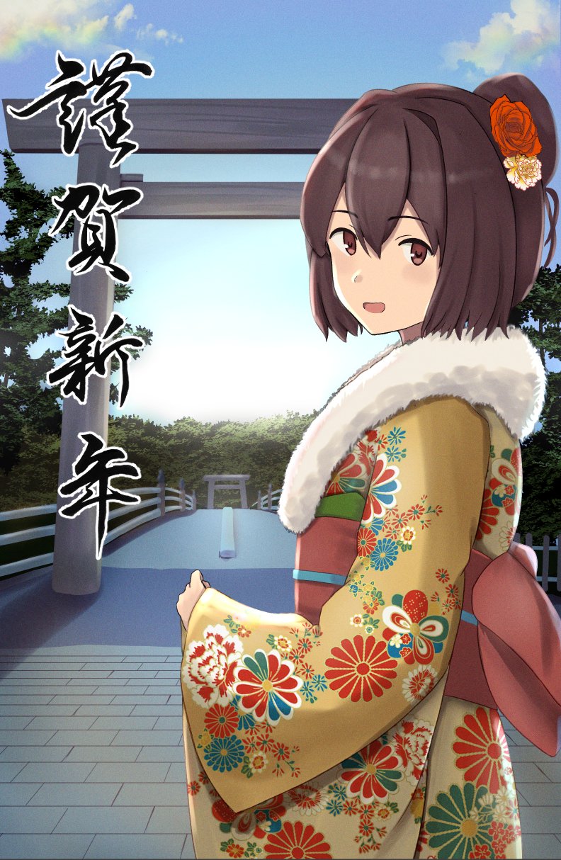 1girl brown_eyes brown_hair cloud cloudy_sky day floral_print furisode hair_ribbon happy_new_year highres ise_(kancolle) japanese_clothes kantai_collection kimono kotou_yogen long_sleeves medium_hair new_year obi open_mouth orange_kimono outdoors ribbon sash shrine sky smile solo stone_floor torii wide_sleeves