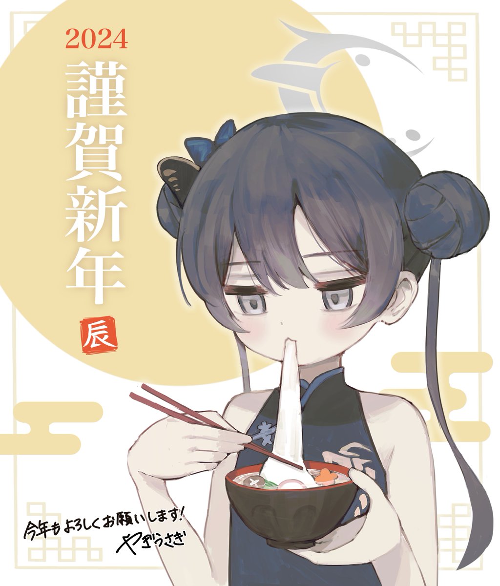 1girl 2024 black_dress black_hair blue_archive blush bowl butterfly_hair_ornament china_dress chinese_clothes chopsticks commentary_request double_bun dress eating flat_chest food grey_eyes hair_bun hair_ornament halo happy_new_year highres holding holding_bowl holding_chopsticks kisaki_(blue_archive) looking_down mochi new_year solo upper_body yagiusagi