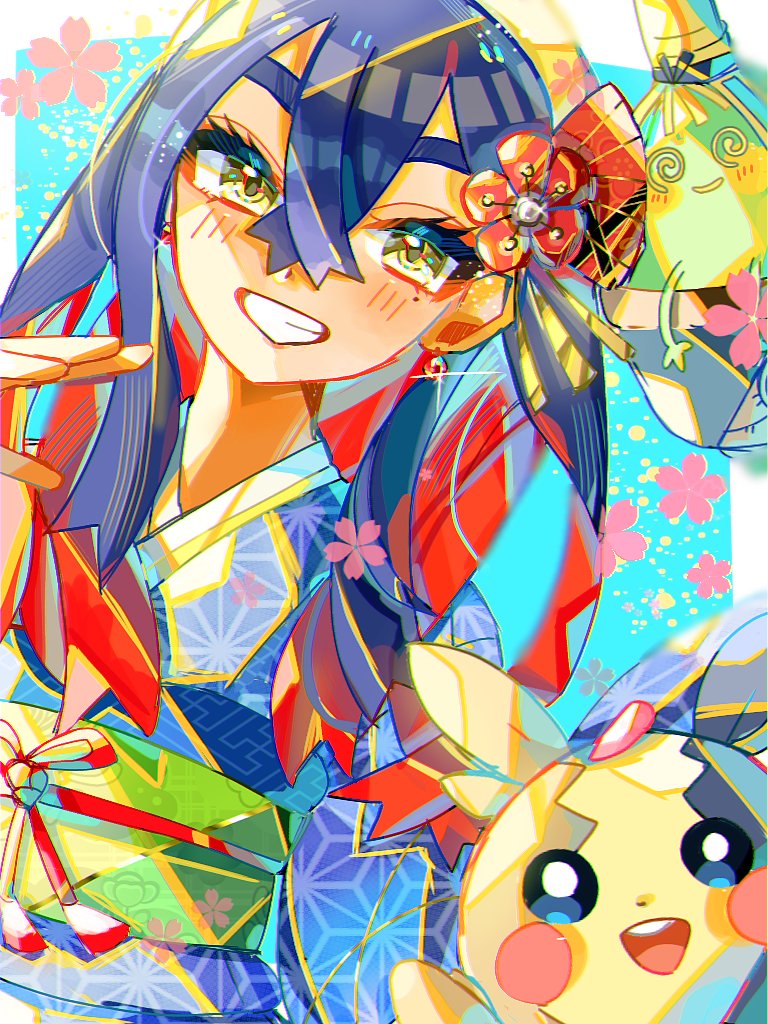 1girl @_@ black_hair blue_kimono carmine_(pokemon) crossed_bangs gen_8_pokemon hair_between_eyes japanese_clothes kimono long_hair looking_at_viewer morpeko morpeko_(full) nfvw2evamr86075 nintendo obi pokemon pokemon_(creature) pokemon_scarlet_and_violet red_hair sash sinistcha smile teeth upper_body yellow_eyes