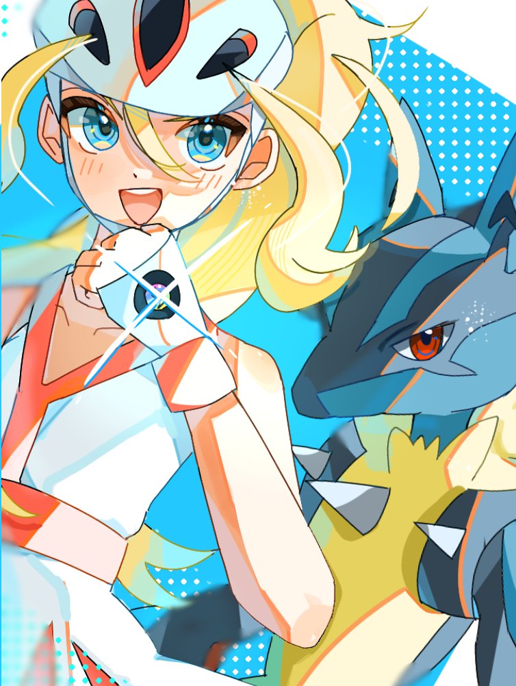 1girl :d bare_shoulders blonde_hair blue_eyes dress fingerless_gloves gen_4_pokemon gloves hair_between_eyes helmet korrina_(pokemon) long_hair looking_at_viewer lucario nfvw2evamr86075 nintendo open_mouth pokemon pokemon_(creature) pokemon_x_and_y sleeveless sleeveless_dress smile teeth upper_body upper_teeth_only white_dress white_gloves