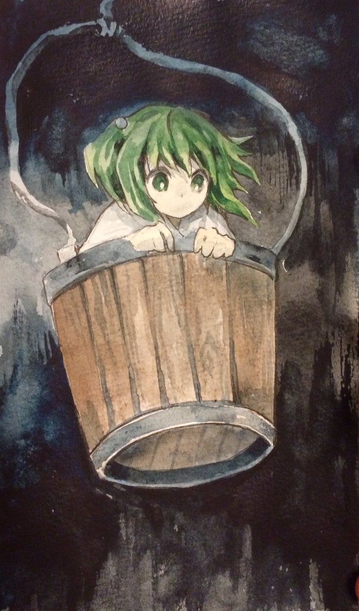 1girl bucket closed_mouth commentary_request green_eyes green_hair highres in_bucket in_container japanese_clothes kaigen_1025 kimono kisume medium_hair painting_(medium) pale_skin short_twintails solo touhou traditional_media twintails watercolor_(medium) white_kimono wooden_bucket