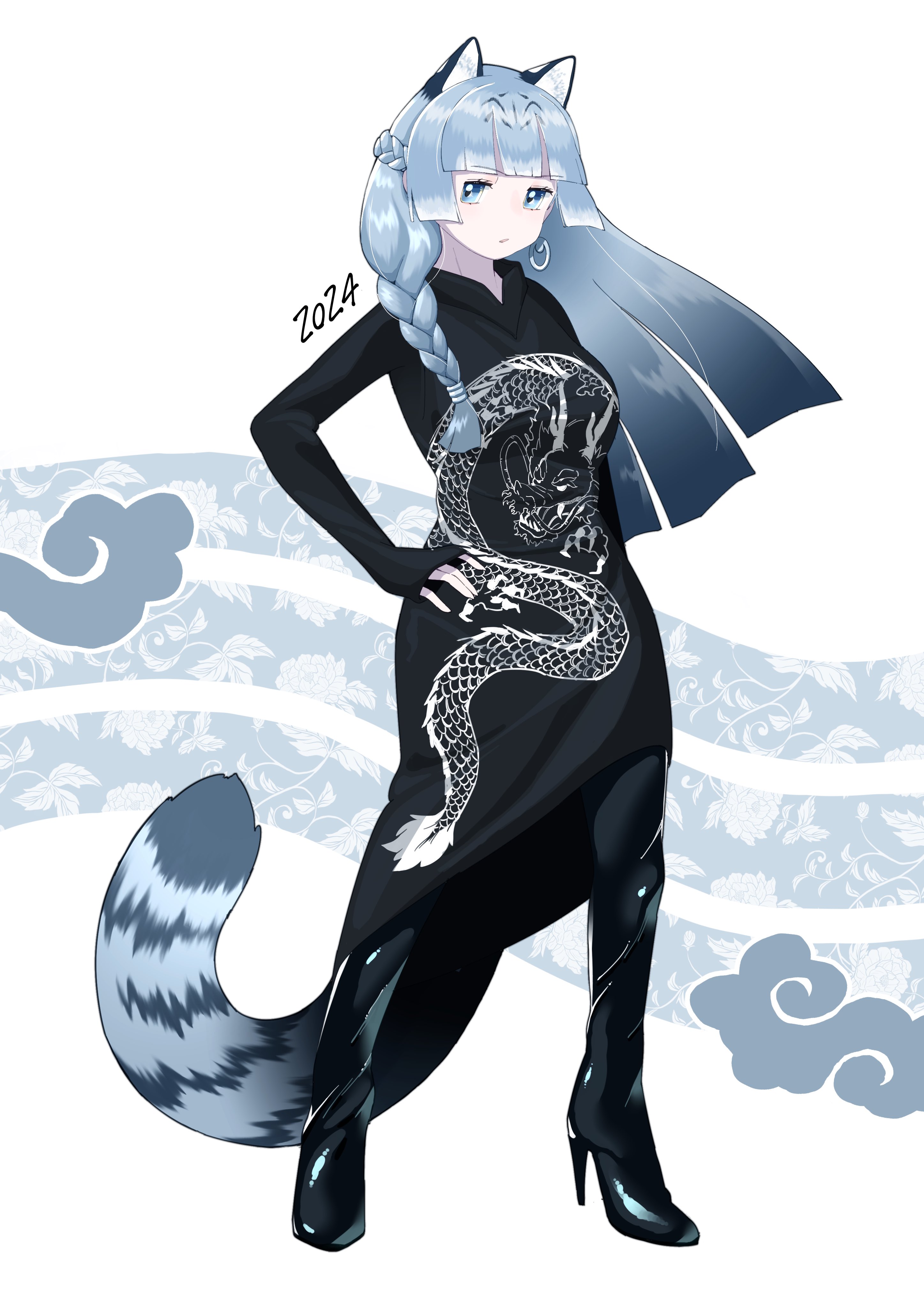 1girl 2024 absurdres alternate_costume alternate_hairstyle animal_ears black_boots black_dress blue_eyes blunt_bangs boots braid crown_braid dragon dress earrings eastern_dragon grey_hair highres jewelry kemono_friends leopard_ears leopard_girl leopard_tail long_dress long_hair long_sleeves multicolored_hair parsley_(simonov1941) shiny_footwear sidelocks sleeves_past_wrists snow_leopard_(kemono_friends) snow_leopard_ears snow_leopard_tail solo tail thigh_boots