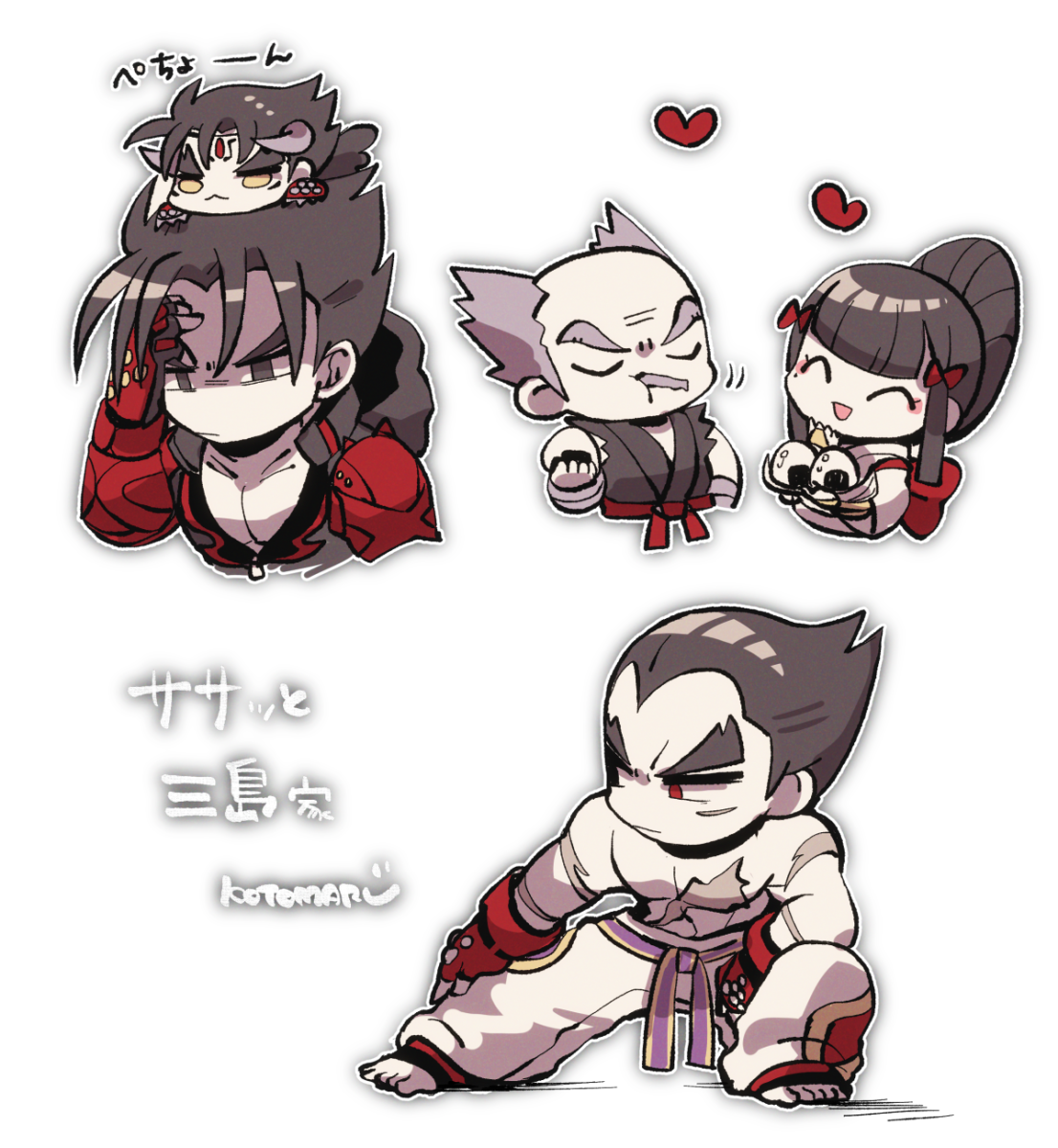 1girl 4boys ^_^ belt black_eyes black_hair bow closed_eyes closed_mouth devil_jin dougi facial_scar food gloves grey_hair hand_on_own_head heart highres holding holding_food kazama_jin kotomaru_(kotokoto_kottan) mishima_heihachi mishima_kazumi_(tekken) mishima_kazuya multiple_boys no_nose on_head onigiri pants purple_belt red_bow red_eyes red_gloves scar scar_on_arm scar_on_cheek scar_on_chest scar_on_face stretching studded_gloves tekken thick_eyebrows topless_male v-shaped_eyebrows white_pants