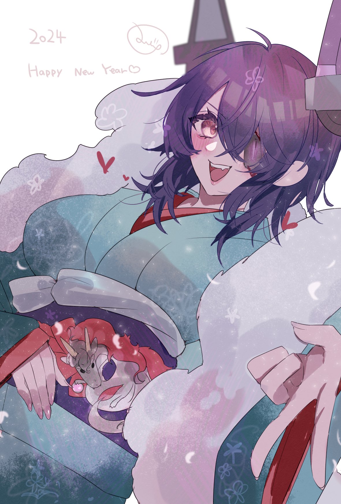 1girl 2024 alternate_costume aqua_kimono dragon_print eyepatch fur_scarf gyaru_v happy_new_year highres japanese_clothes kantai_collection kimono mizoredama1 new_year open_mouth purple_hair red_eyes short_hair smile solo teeth tenryuu_(kancolle) upper_teeth_only v white_background