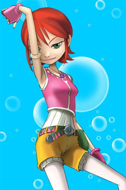 1girl ami_(aqua_kids) aqua_kids belt breasts closed_mouth fingerless_gloves gloves green_eyes haruyama_kazunori jewelry looking_at_viewer necklace pink_gloves red_hair short_hair shorts shorts_under_shorts small_breasts smile solo translated yellow_shorts