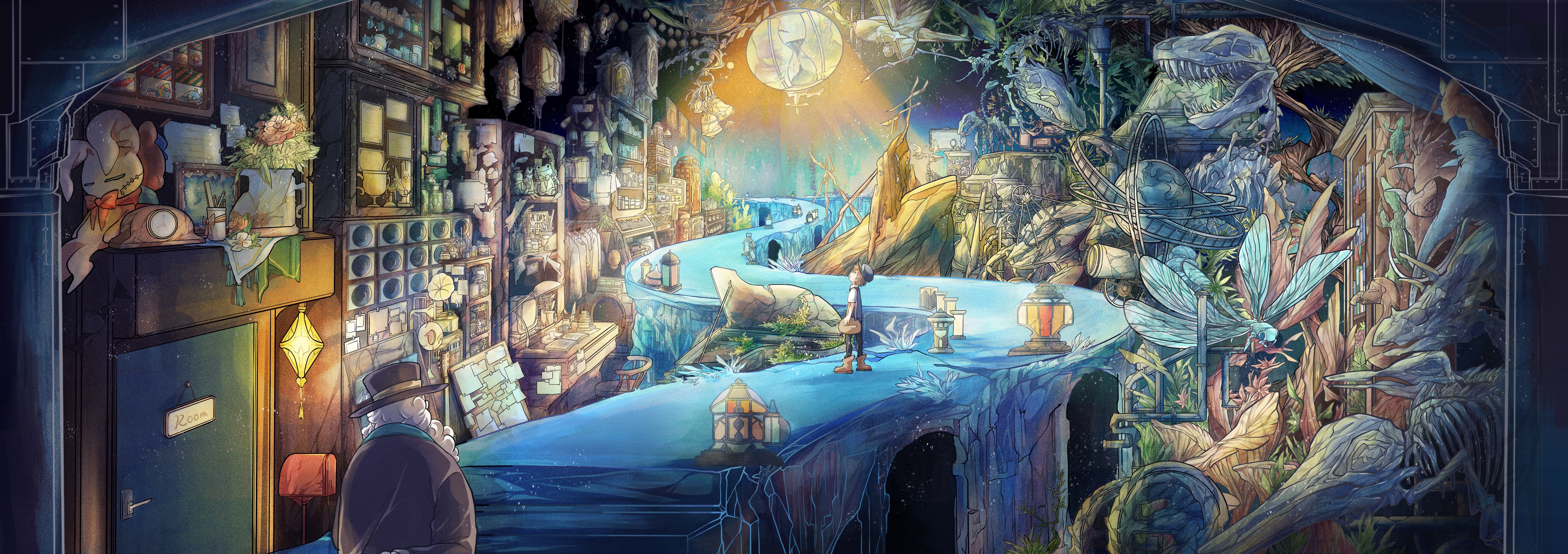 2boys absurdres aircraft airplane azure-aoi- bag beard bell black_headwear blue_headwear blue_shirt book bookshelf boots broken_glass broken_window bug cactus candelabra candle candlestand chair clock clothes coffee_mug commentary_request cup deer desk desk_lamp dinosaur dinosaur_skeleton door dragonfly drawer facial_hair flower fossil glass globe grand_piano grey_hair guitar handbag hat highres hourglass ice industrial_pipe insect instrument key keyring lamp light_rays lizard long_beard long_sleeves mailbox_(incoming_mail) motor_vehicle mug multiple_boys original overgrown painting_(object) pants paper path pendulum phonograph piano picture_frame plant propeller road scenery shirt short_sleeves stairs stuffed_animal stuffed_rabbit stuffed_toy surreal teacup trophy wide_shot window