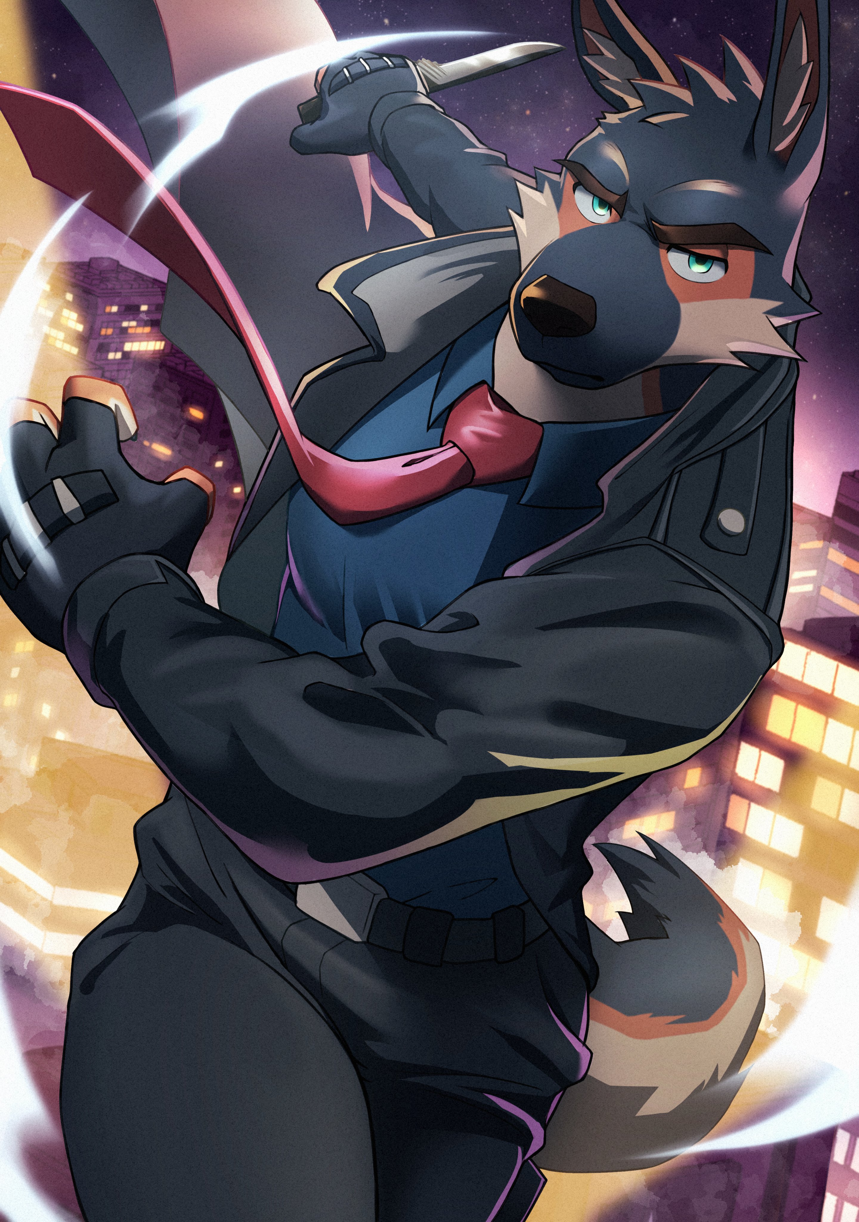 1boy absurdres animal_ear_fluff animal_ears another_eidos-r attack_trail bara barlitz_(another_eidos) belt black_coat black_pants blue_shirt cityscape closed_mouth coat cowboy_shot dog_boy dog_ears fighting_stance fingerless_gloves furry furry_male gloves highres holding holding_knife knife kou_(kouga0225) looking_at_viewer male_focus multicolored_fur night pants shirt tail thick_eyebrows
