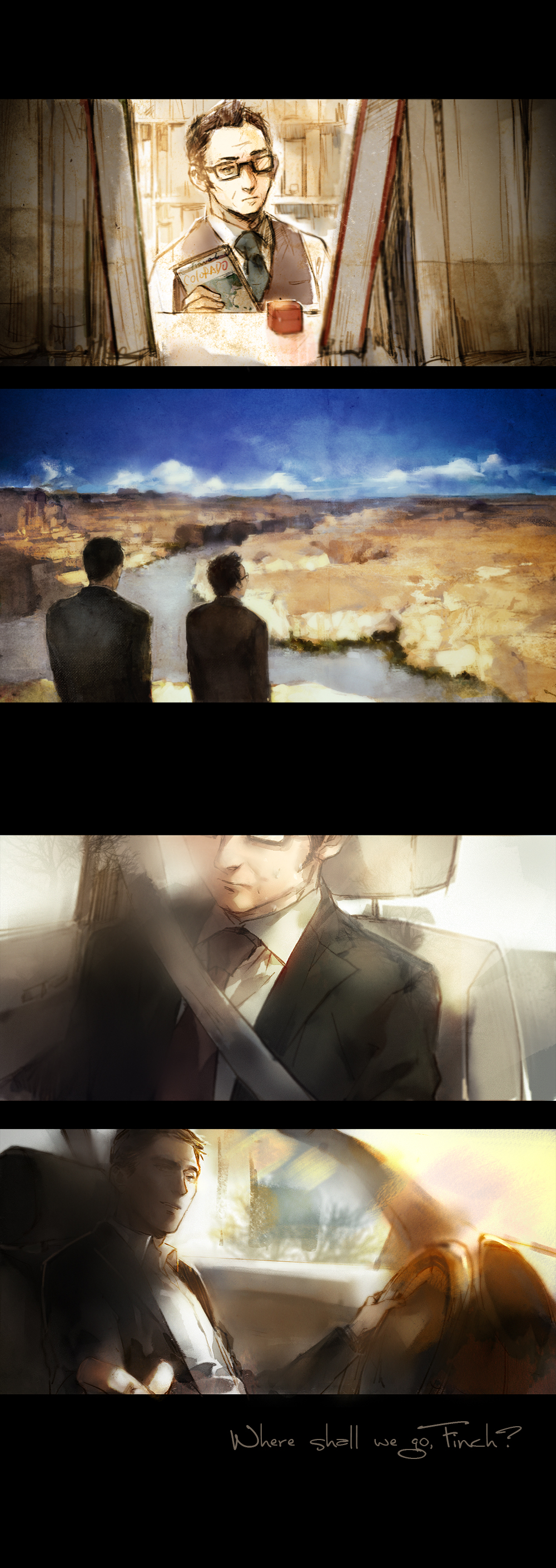 2boys absurdres back black_hair black_suit book car_interior dark-skinned_male dark_skin day desert driving english_text formal_clothes glasses grey_hair hair_slicked_back harold_finch_(person_of_interest) highres holding holding_book indoors john_reese_(person_of_interest) library male_focus mature_male multicolored_hair multiple_boys multiple_views person_of_interest pov reaching reaching_towards_viewer rectangular_eyewear ring_box short_hair sideburns smile streaked_hair suit upper_body wwwe314