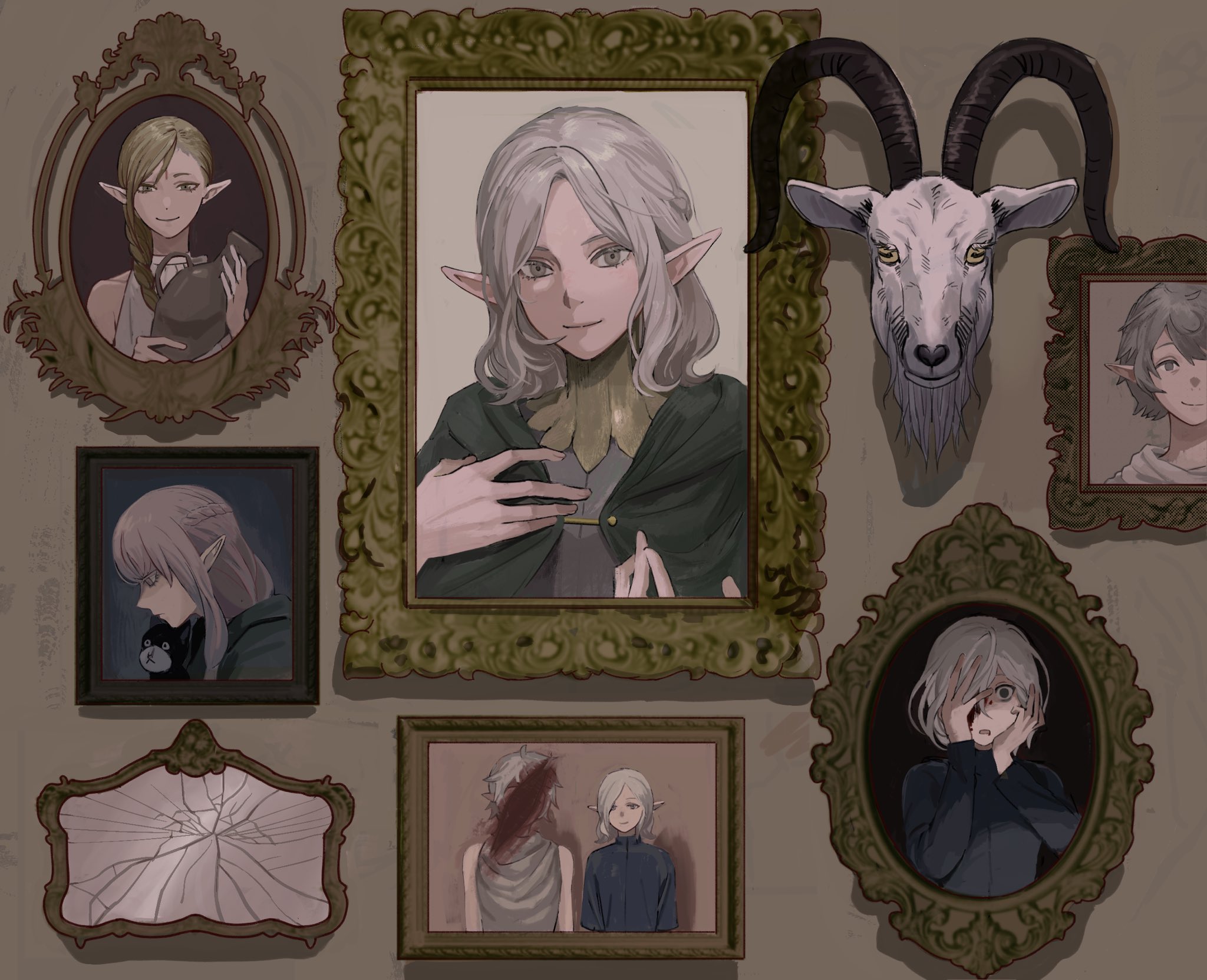 2boys 2girls black_shirt blonde_hair blood blood_on_face braid braided_ponytail_elf_(dungeon_meshi) broken_mirror brothers cloak covering_one_eye dungeon_meshi elf goat goat_(dungeon_meshi) green_cloak grey_eyes grey_hair head-mounted_display highres holding_pitcher hood hood_down hooded_cloak long_hair long_sleeves looking_at_viewer looking_down milsiril mirror mithrun mithrun's_brother multiple_boys multiple_girls pitcher_(container) pointy_ears portrait_(object) shirt short_hair siblings smile stuffed_animal stuffed_cat stuffed_toy xiiiiiiiii