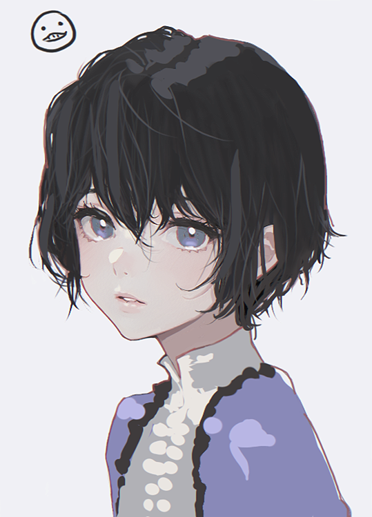 1boy androgynous black_hair blue_eyes cardigan commentary_request d.k emil_(human)_(nier) emil_(nier) from_side grey_background hair_between_eyes light_blush lips looking_at_viewer looking_to_the_side male_focus nier nier_(series) parted_lips portrait purple_cardigan shirt short_hair simple_background solo trap white_shirt